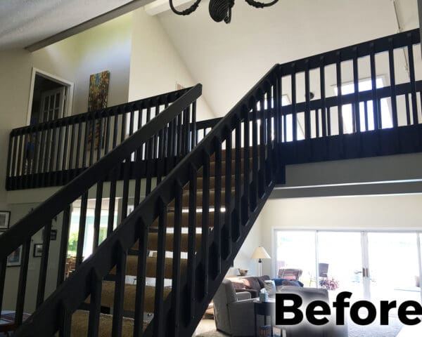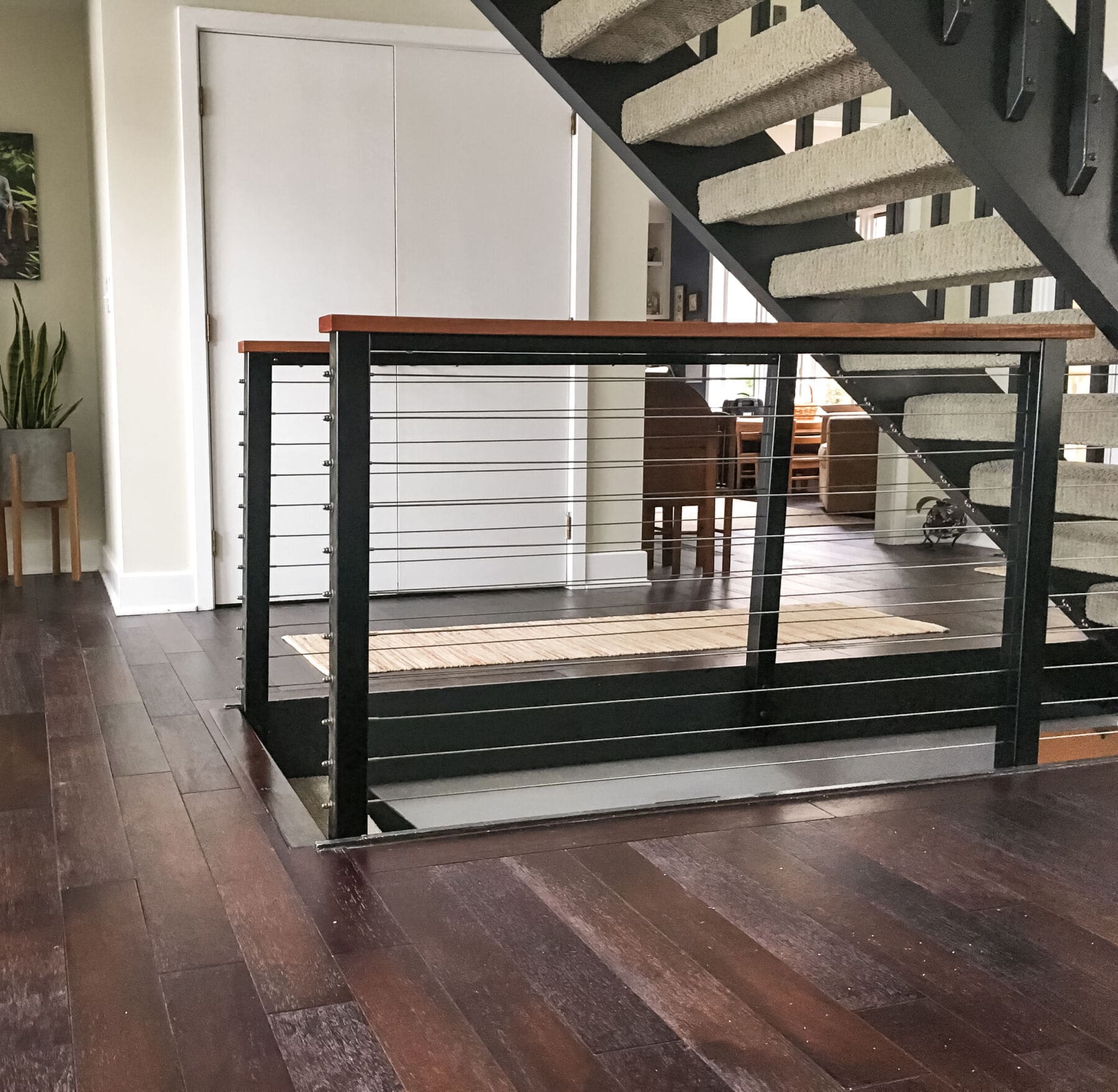 With two staircases stacked on top of each other in the middle of their living space, these homeowners used our cable railings to keep things safe, but open. The black aluminum and Balau frame is visually striking while being vastly less obstructive than the previous railing. For the lower staircase, these customers created a gap-less railing by using our surface mount toggle terminals to anchor the cable to the underside if the upper staircase.