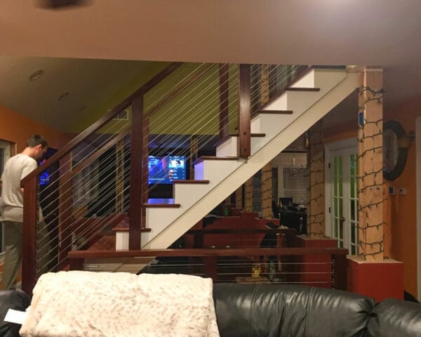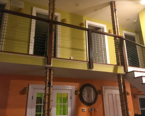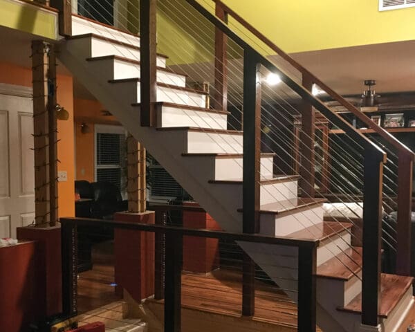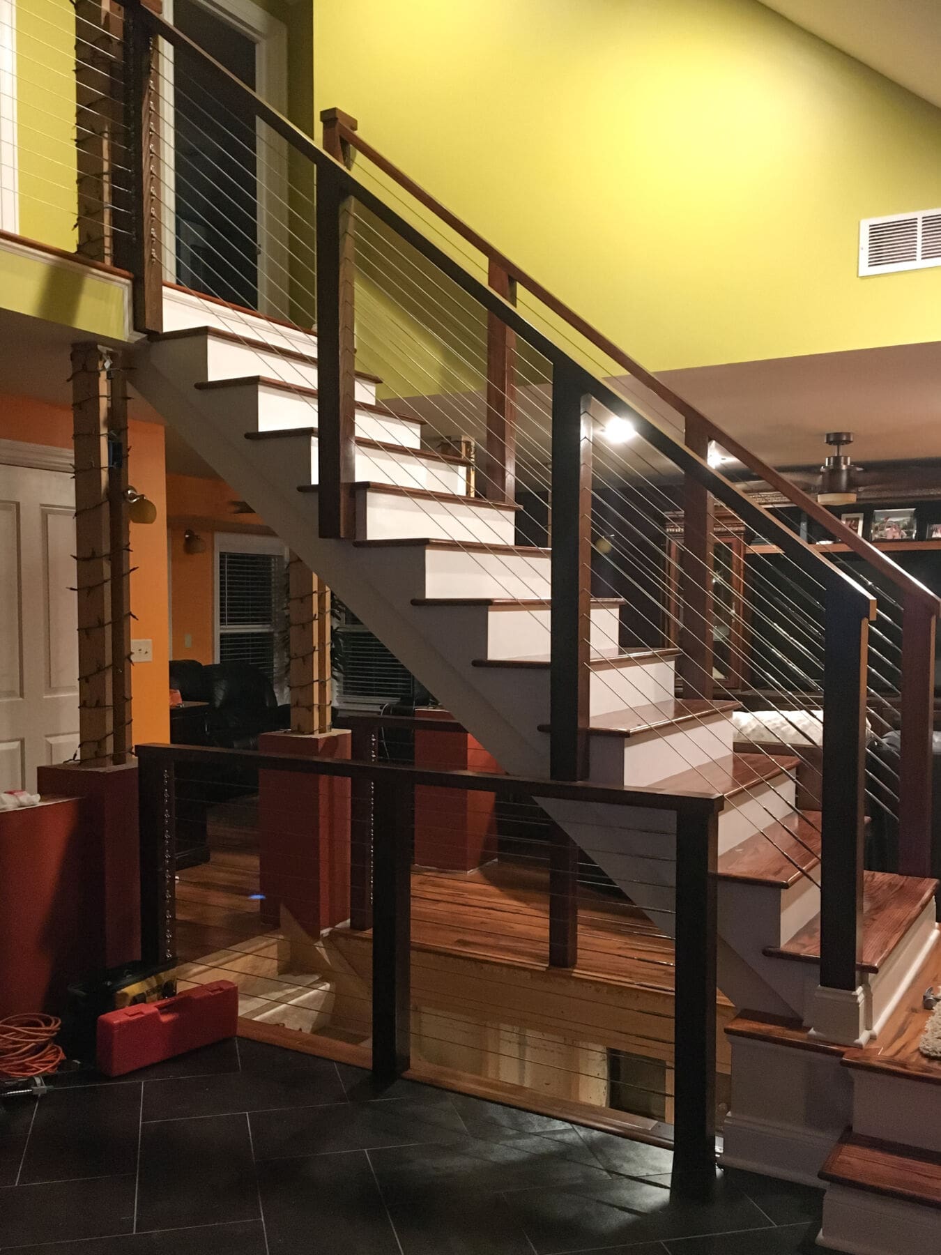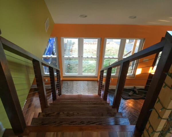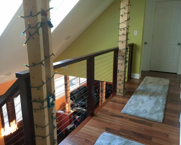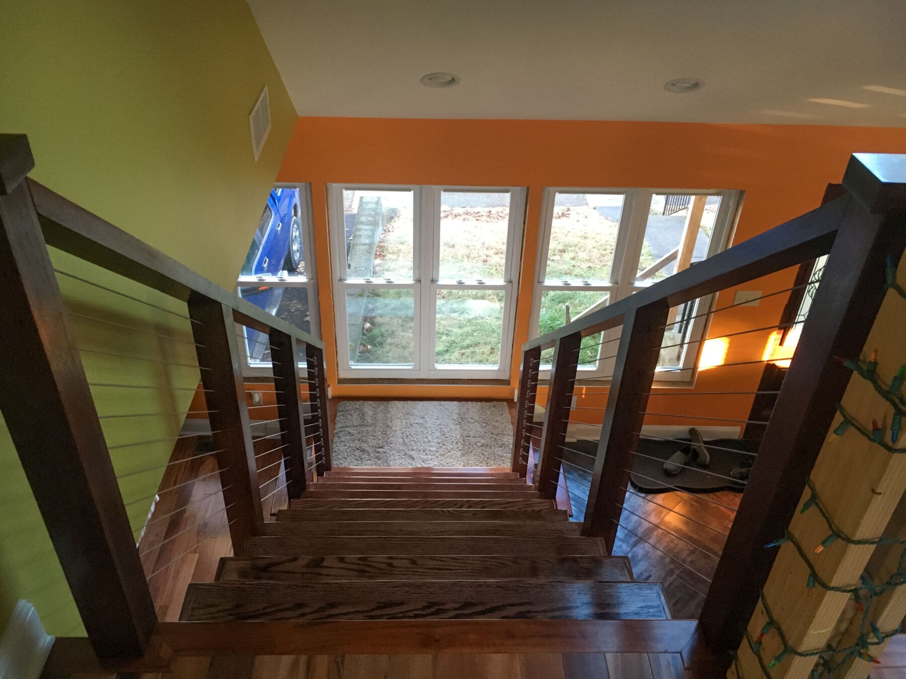 Red Balau cable railing matches the hardwood stair treads and flooring perfectly in this Pennsylvanian home. Surface mount fittings allow the end posts to remain undrilled for a clean look, while the deep color of the wood adds refreshing contrast against the lime green and orange walls of the house.