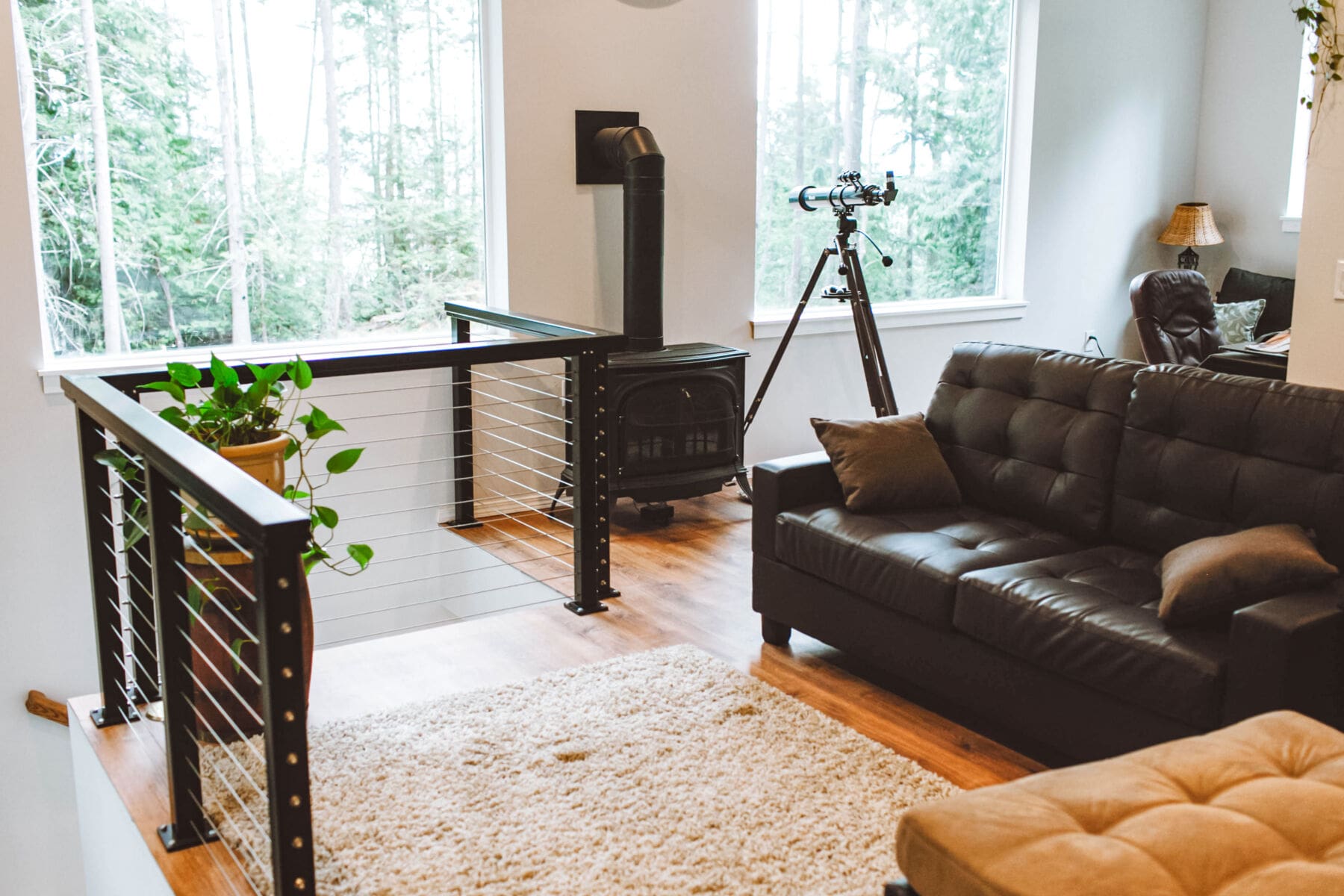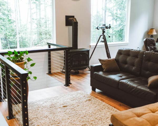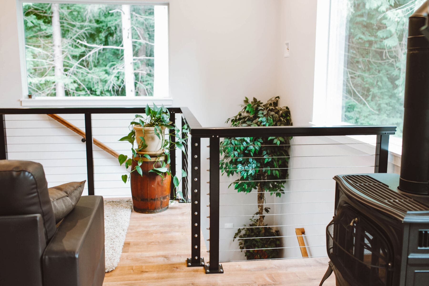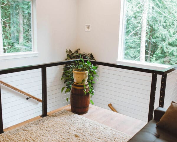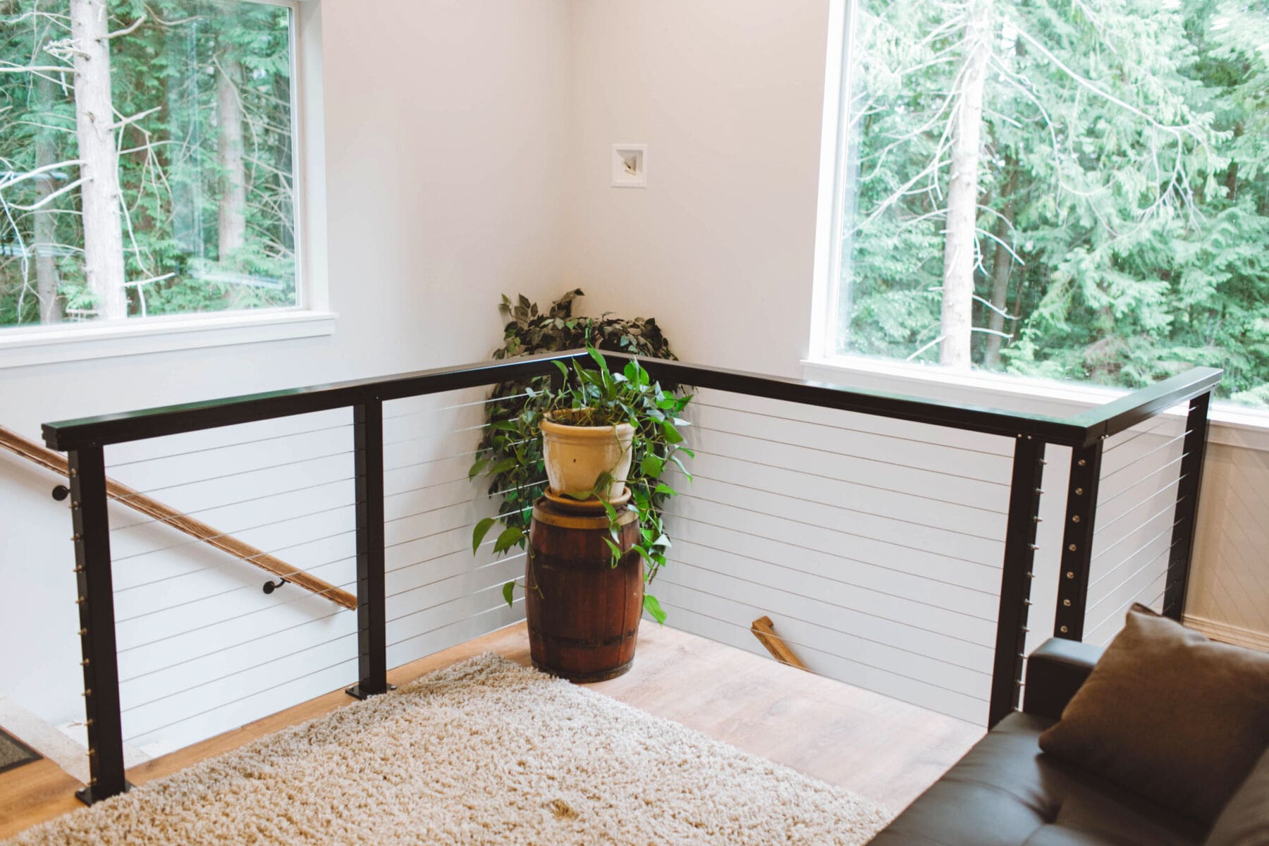 Inside this bright home in Anacortes, WA, railing was needed to keep the area above the stairwell safe. Cable railing was the perfect choice to go with the house's contemporary farmhouse aesthetic. This system keeps the area open, building on the spacious atmosphere created by large windows and white walls.