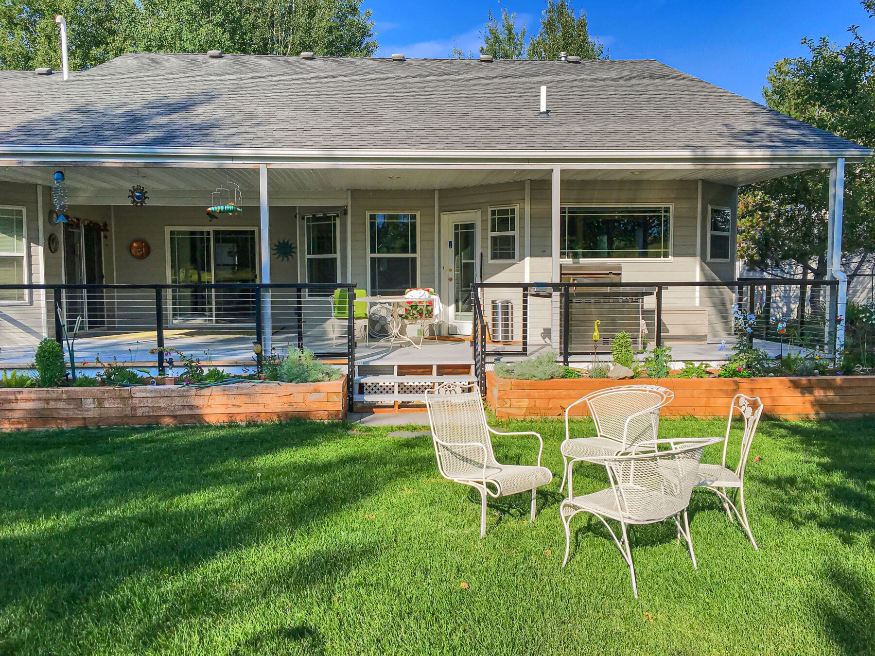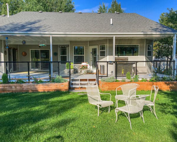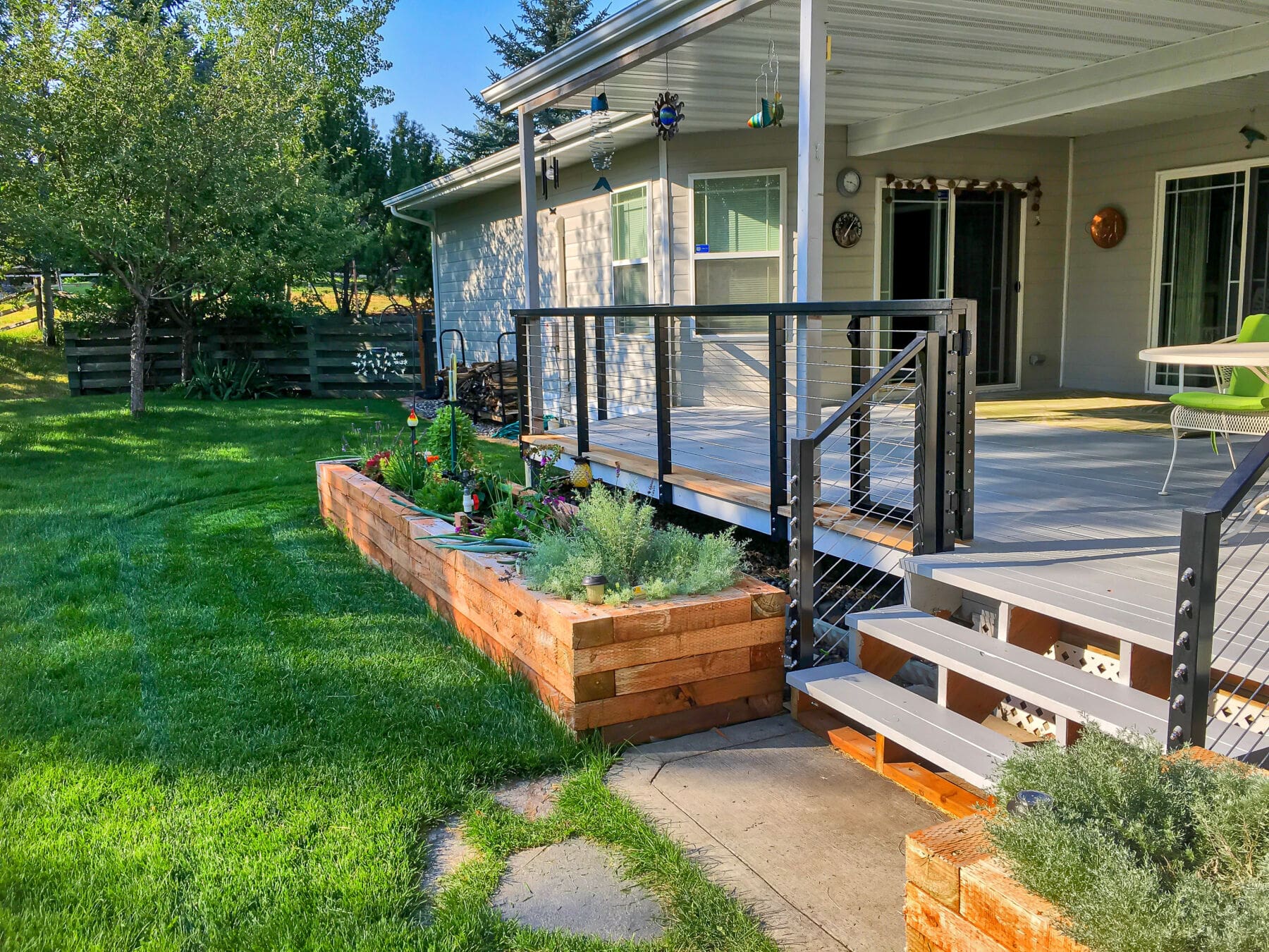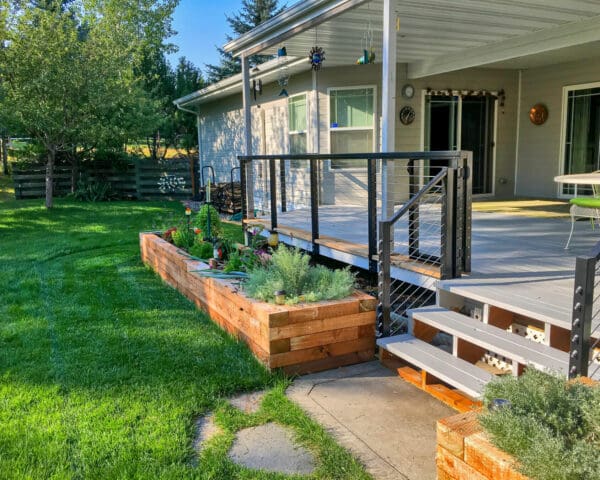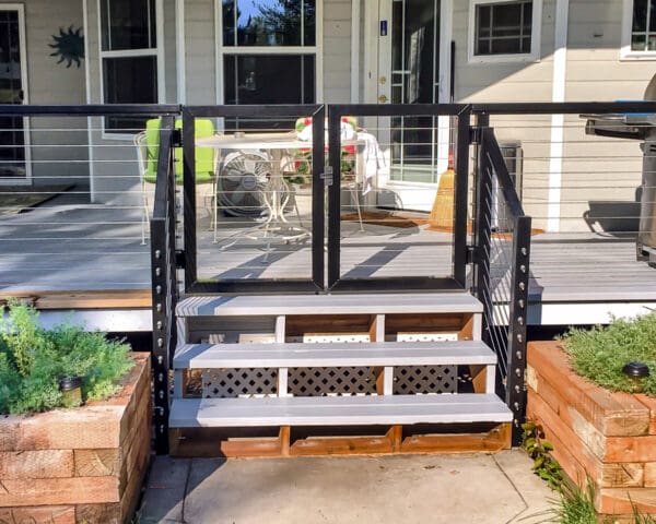 Black aluminum framing stands out dramatically against this wrapping elevated deck. The cable provides safety without obstructing the homeowners’ view of their yard, while a matching gate provides a subtle amount of additional safety.