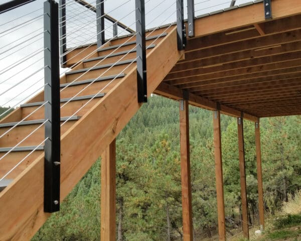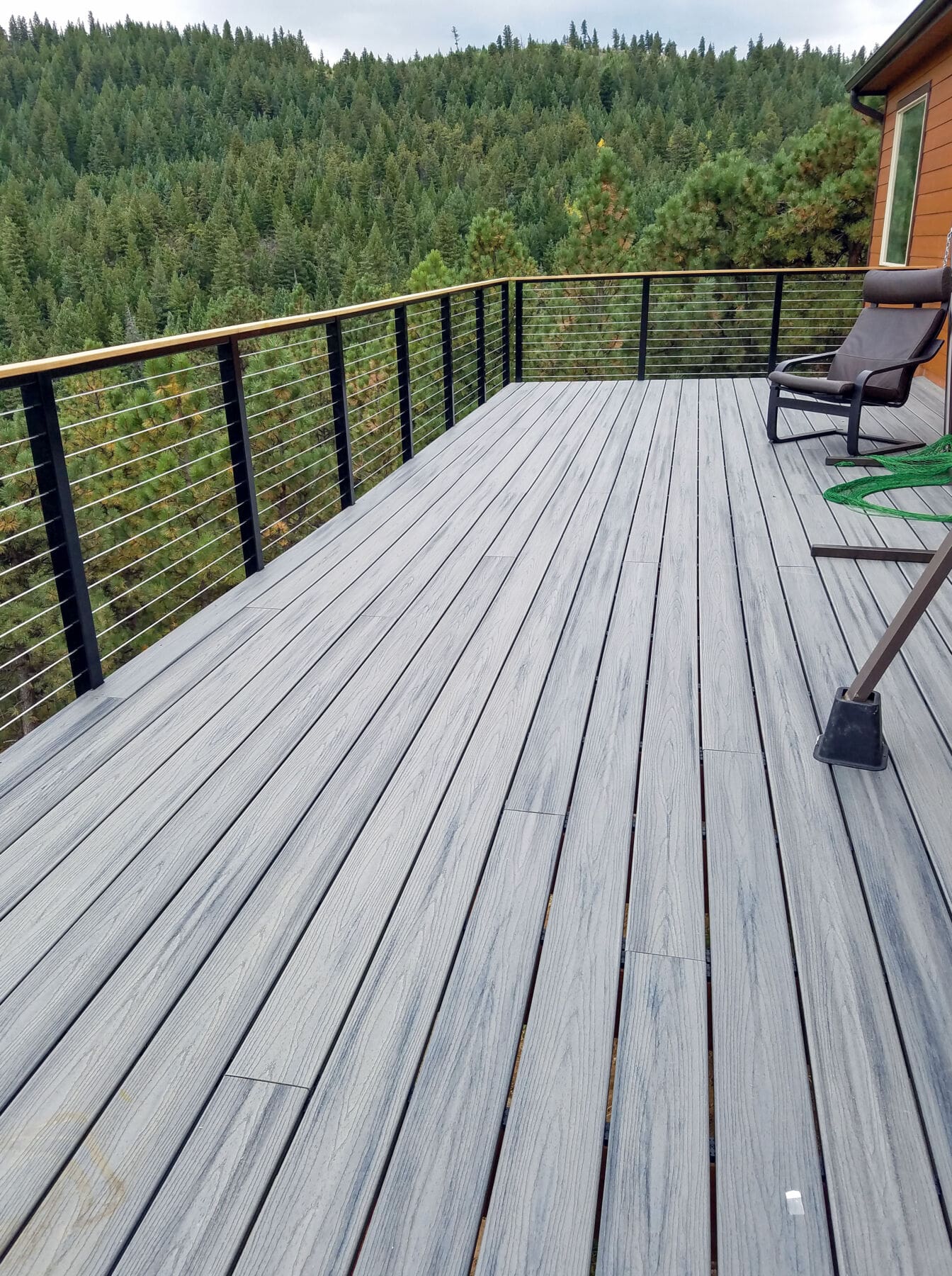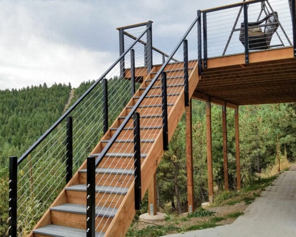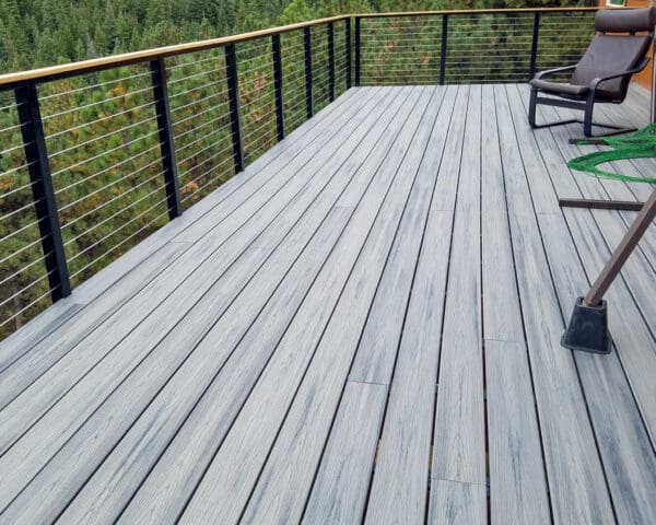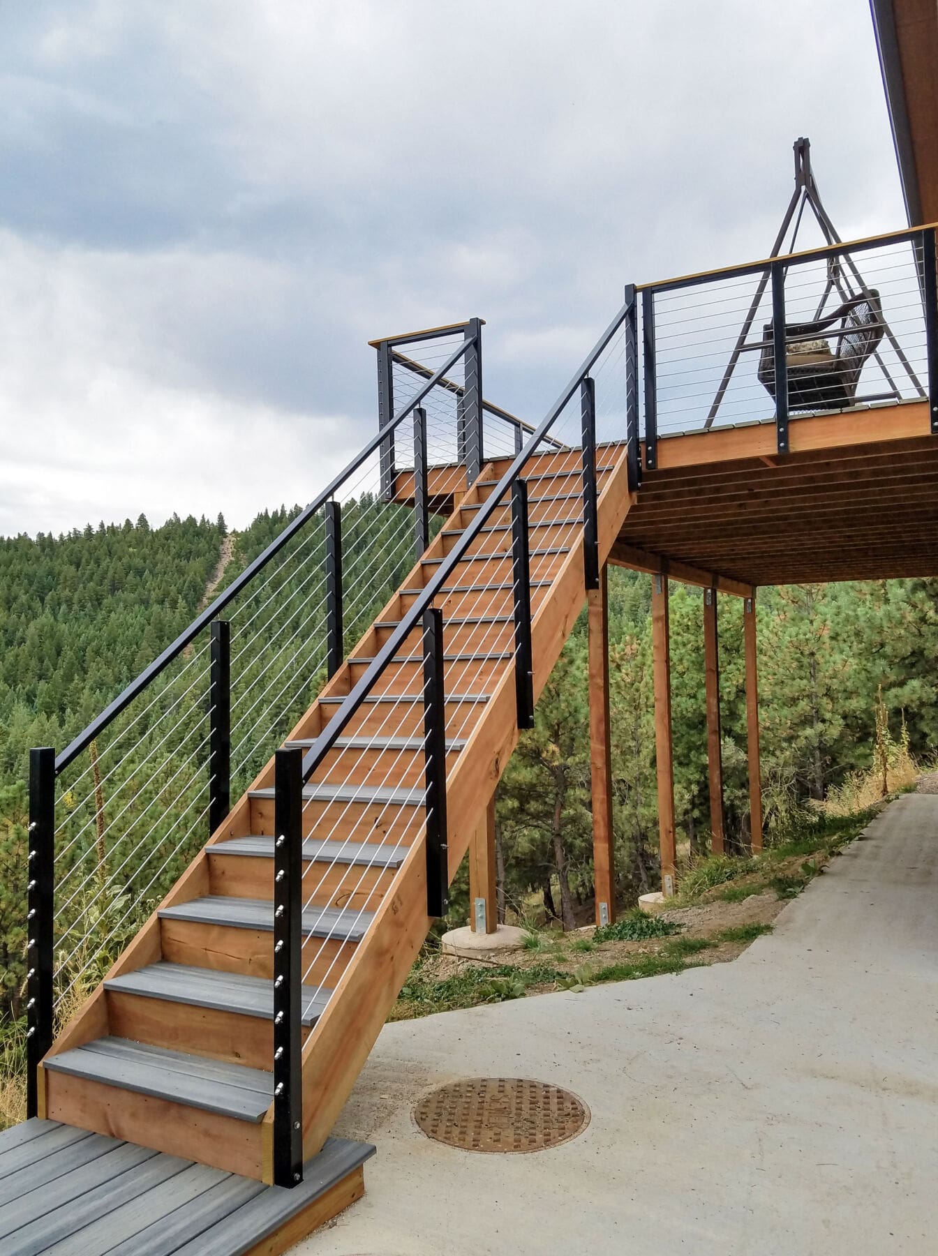 Surrounded by a sea of evergreen trees, this Colorado deck stands out with style. Built using silver- and gold-tone wood, topped with a jet black railing, the deck simultaneously feels contemporary and rustic.