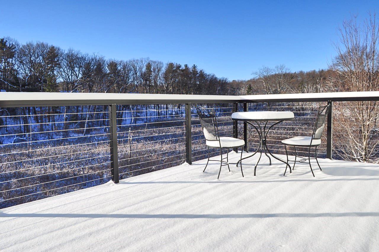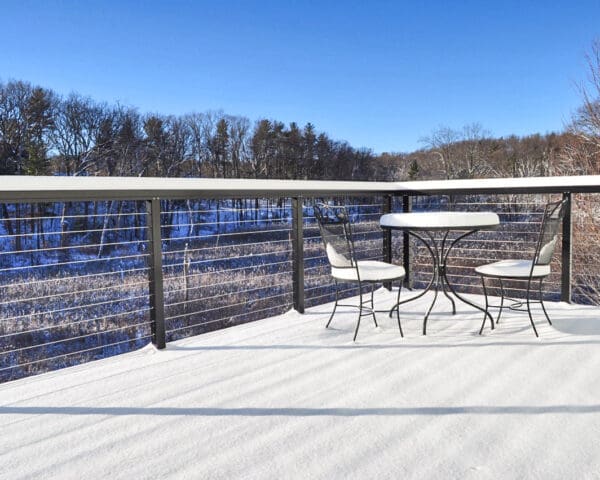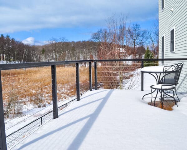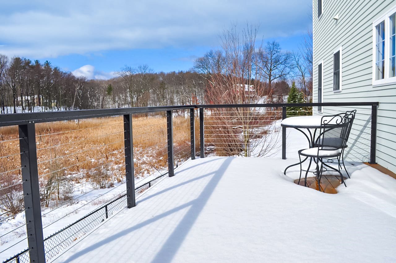 Proving that our railings are perfect for any climate, black aluminum cable railing elegantly withstands inches of snow on this chilly winter deck in Massachusetts. The snow melts effortlessly off the coated aluminum, leaving behind no rust or damage.