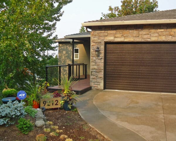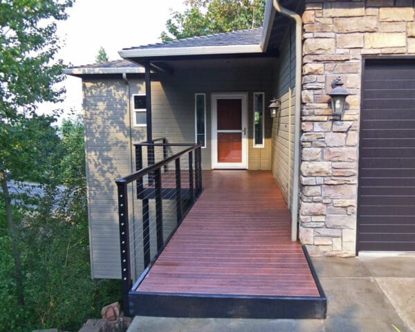 With a catwalk porch suspended over a steep hillside, this homeowner needed to choose a railing that was both safe and stylish. The black aluminum railing with a shaped top rail embodies both these qualities, while the fascia-mount posts keep the walkway as open as possible.