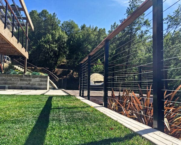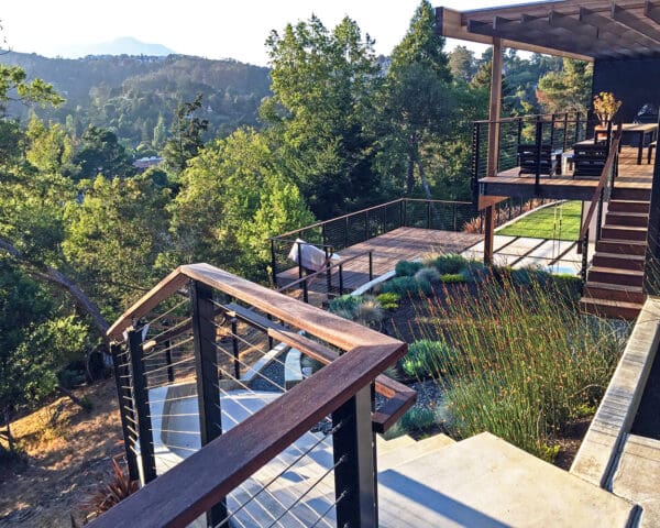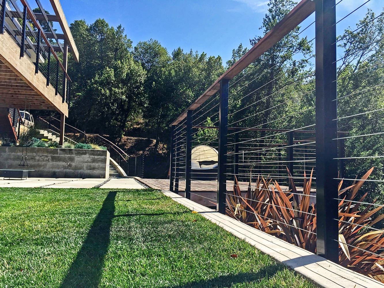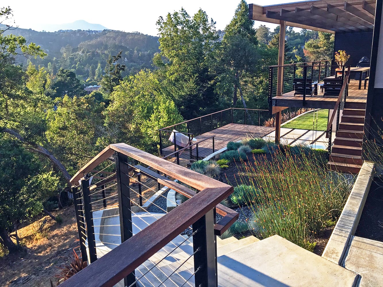 Built on a downward slope with a view of California hills, this tiered backyard required a lot of railing to keep each level safe. The black aluminum fits perfectly with the dramatic and contemporary style of the house, while the fascia-mount posts maximize horizontal space.