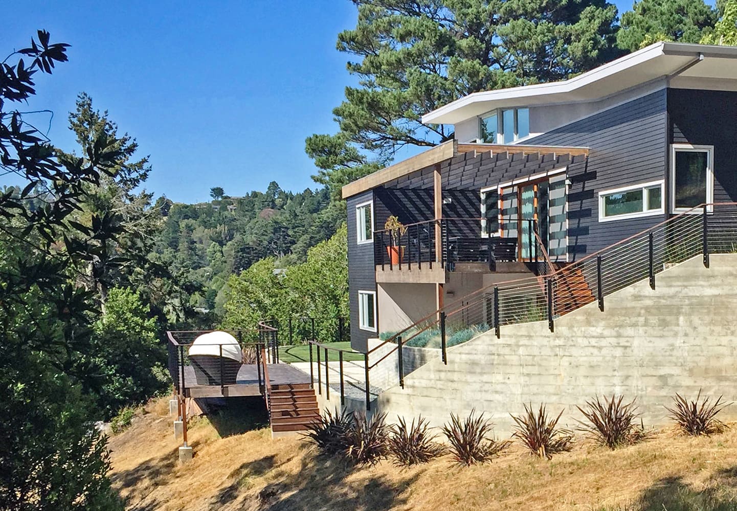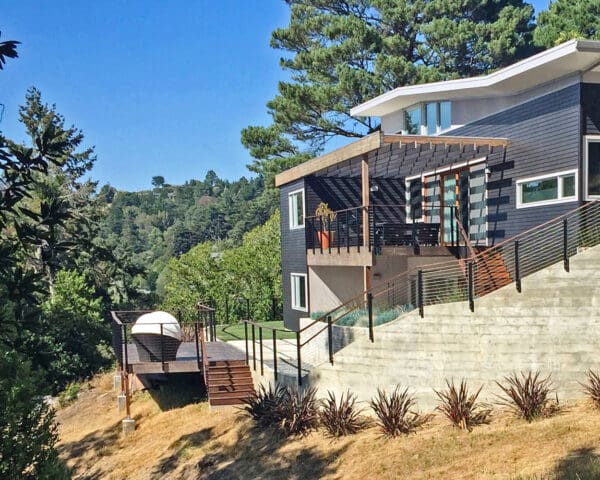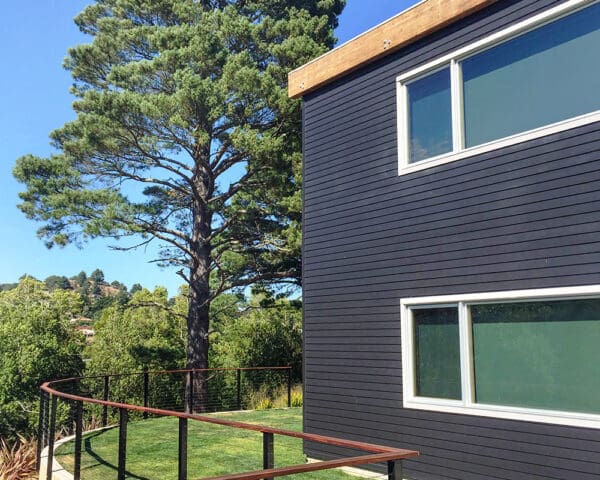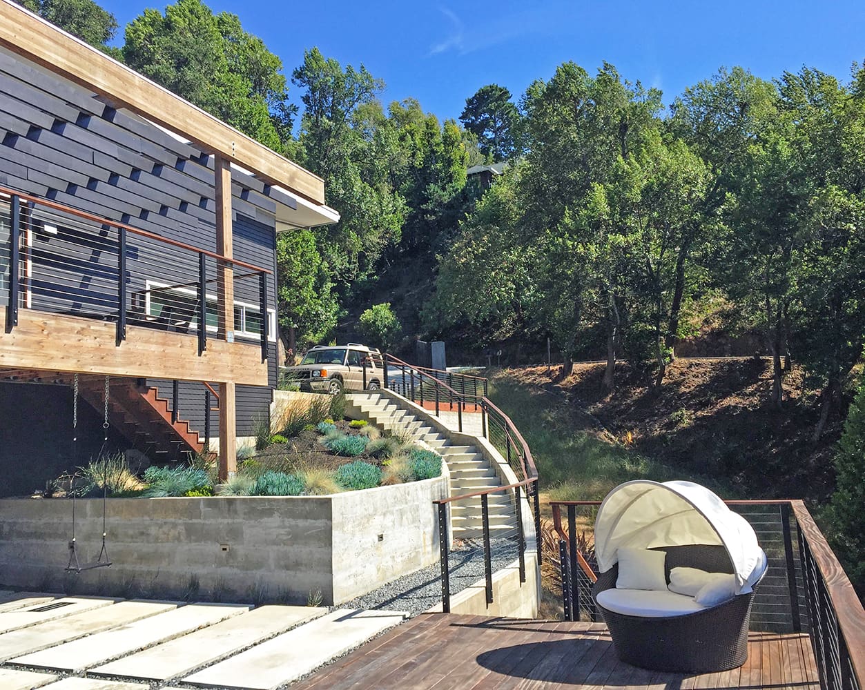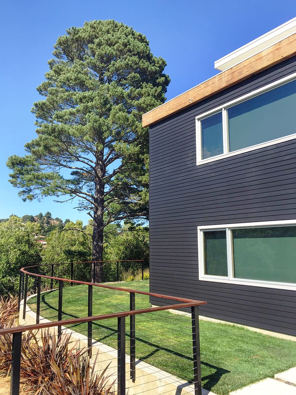 Built on a downward slope with a view of California hills, this tiered backyard required a lot of railing to keep each level safe. The black aluminum fits perfectly with the dramatic and contemporary style of the house, while the fascia-mount posts maximize horizontal space.