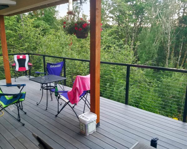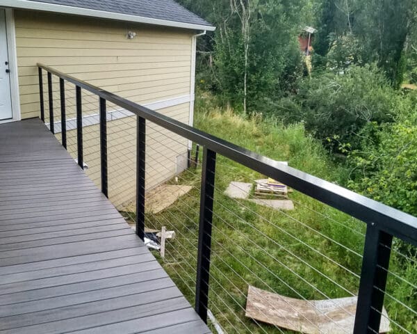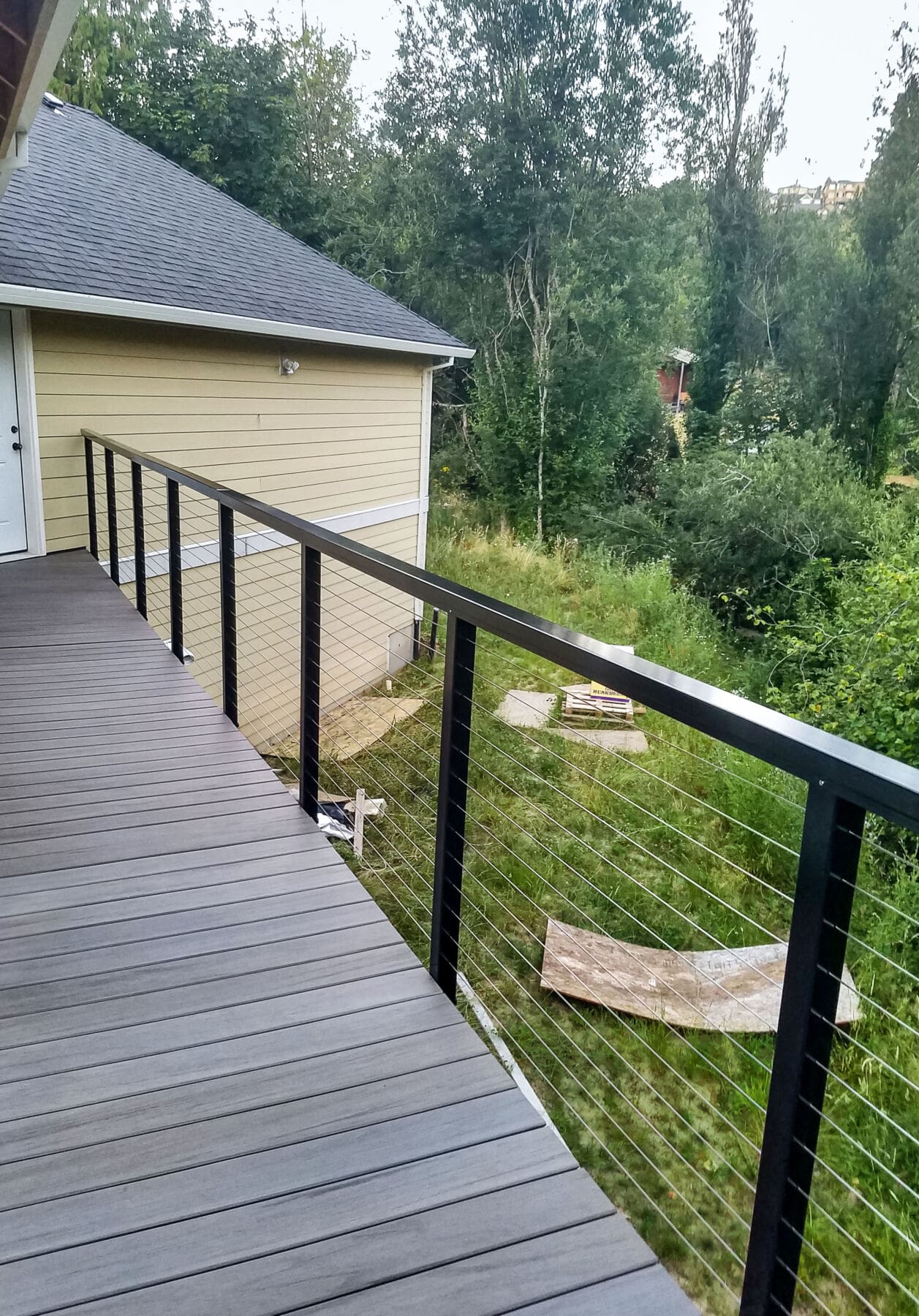 Cable railing opens up this long deck in Portland, OR to the greenery surrounding it.