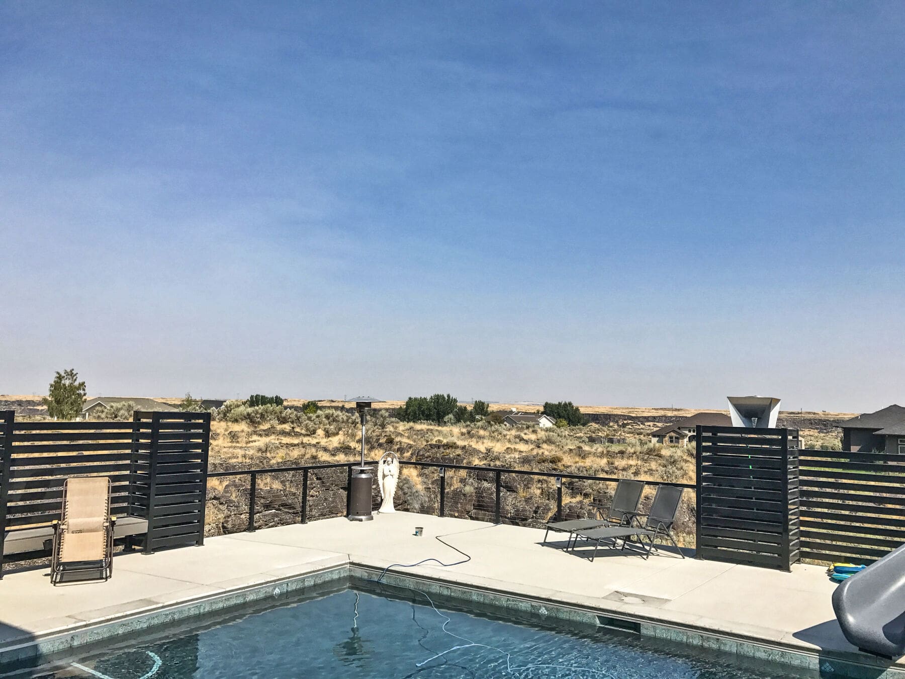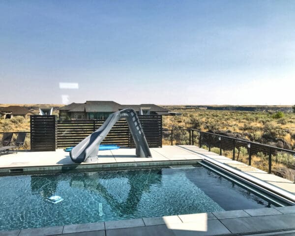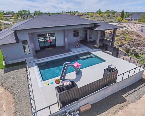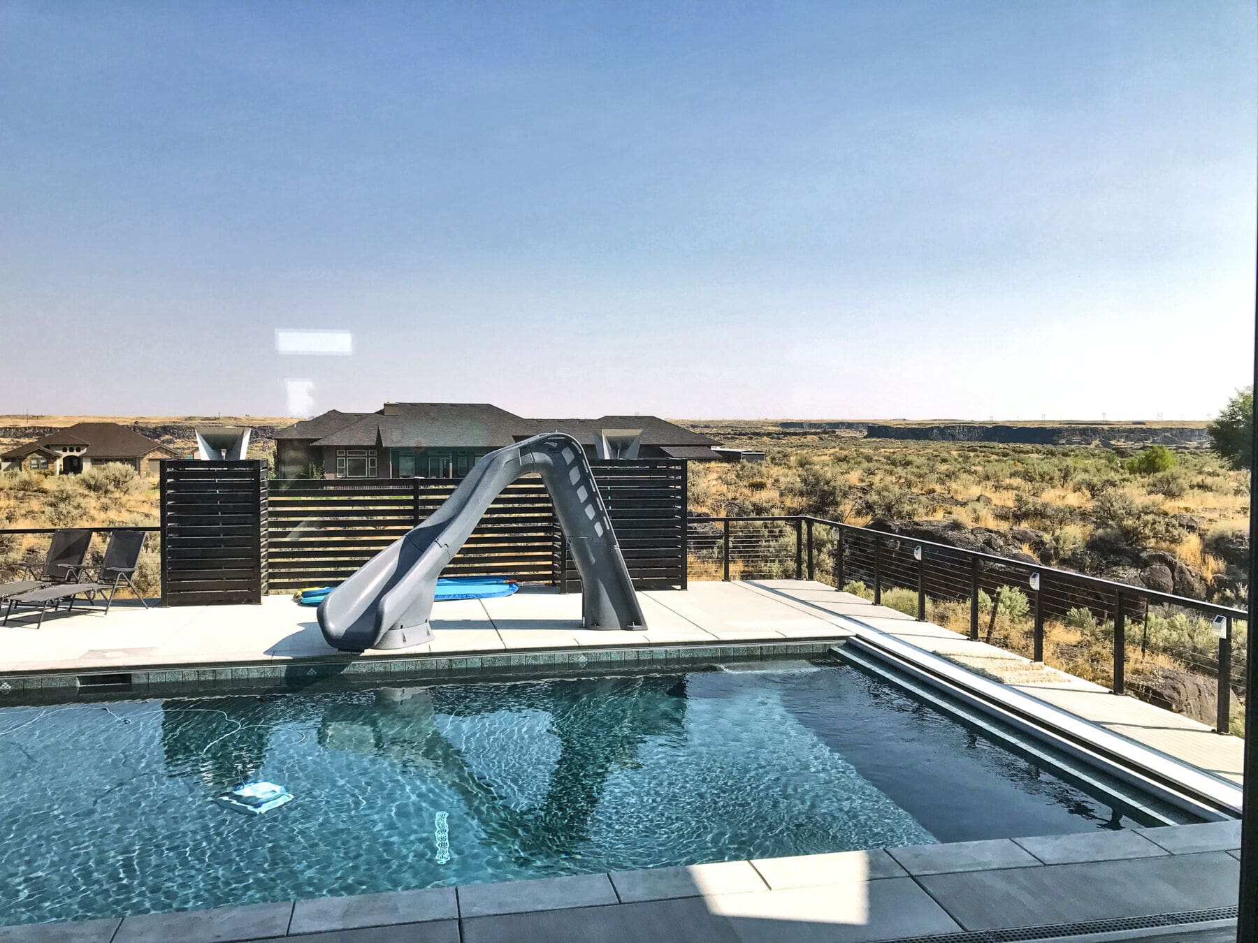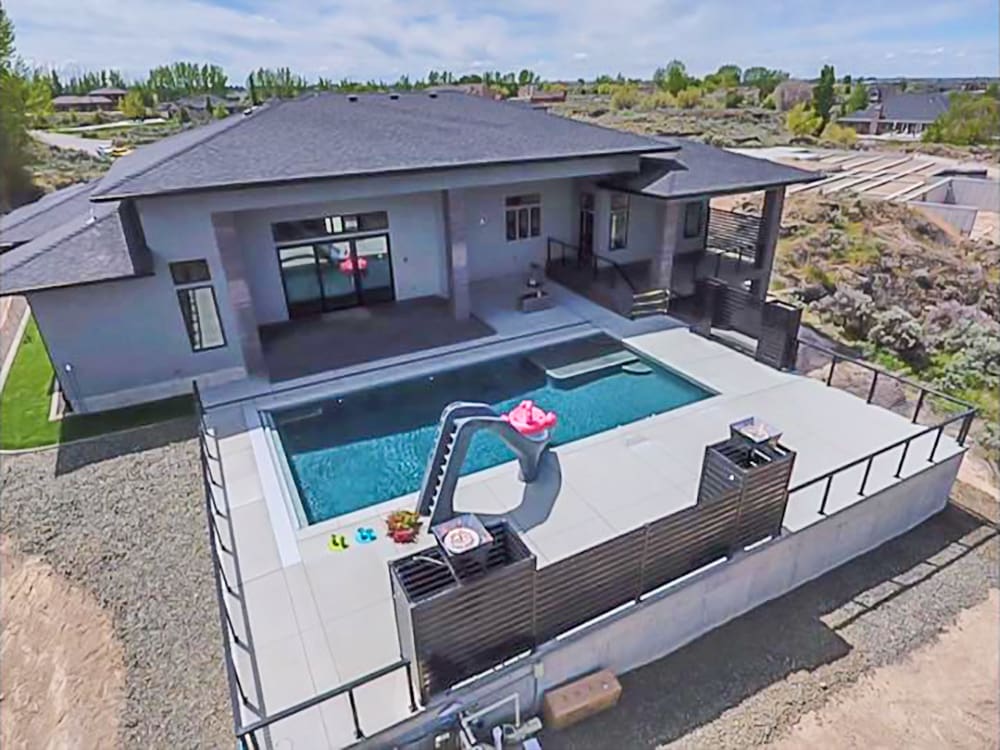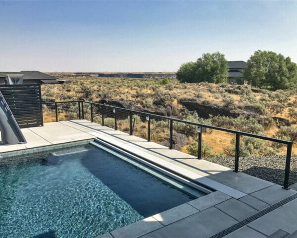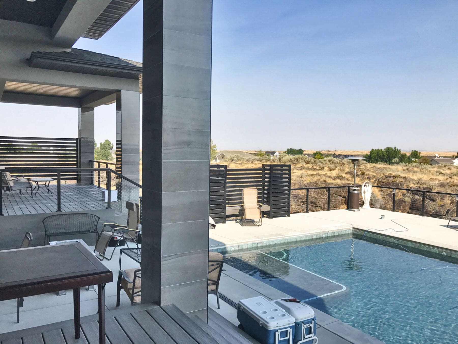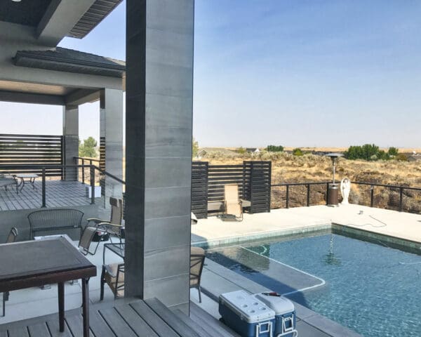 With mirror-finish columns, geometric shapes, and dark rails, this backyard patio and pool area has a strong contemporary presence that stands out dramatically against fields of grass and stone.