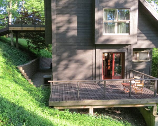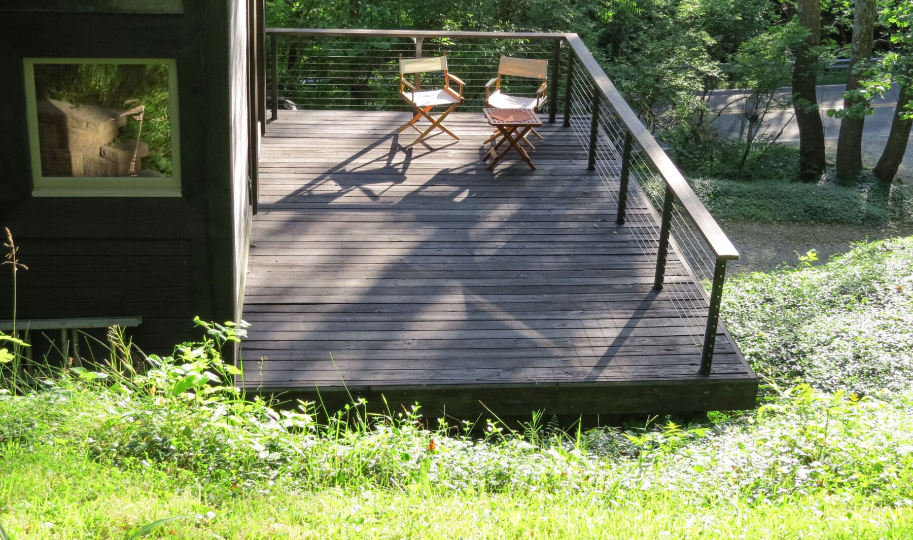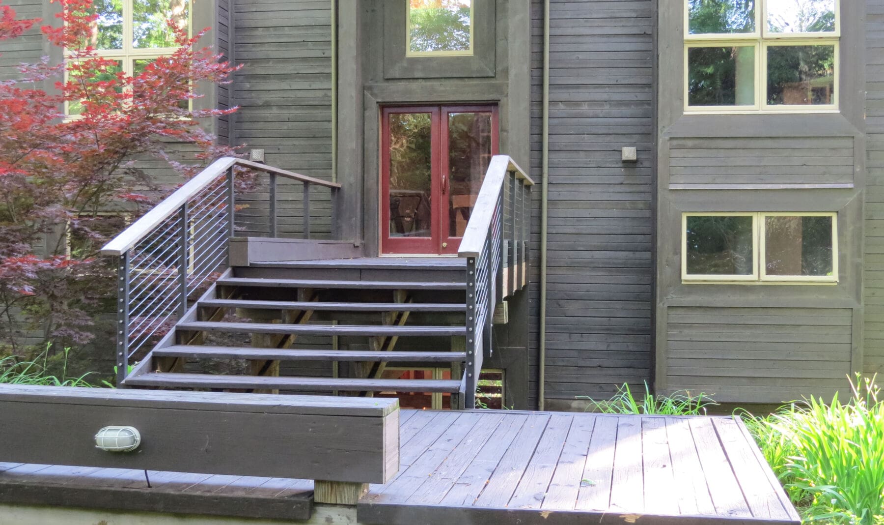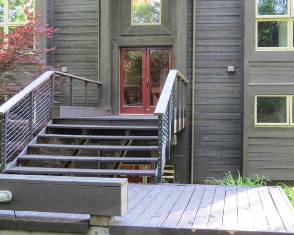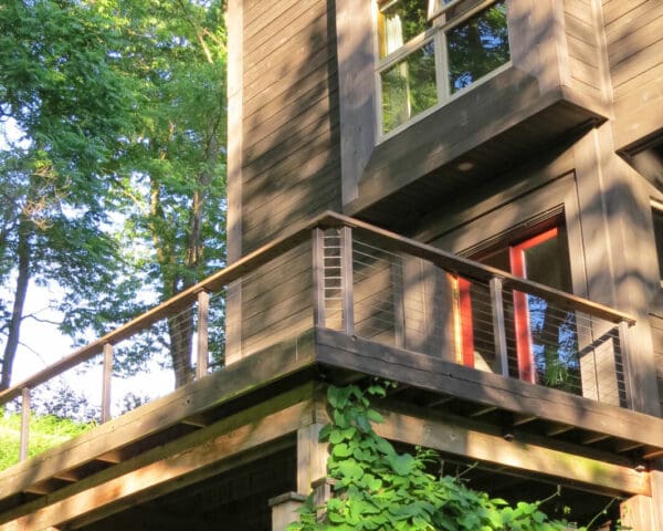 The style and color of our railing blends beautifully with the earthy tones and wood plank siding of this forested house in the hills of Ohio.