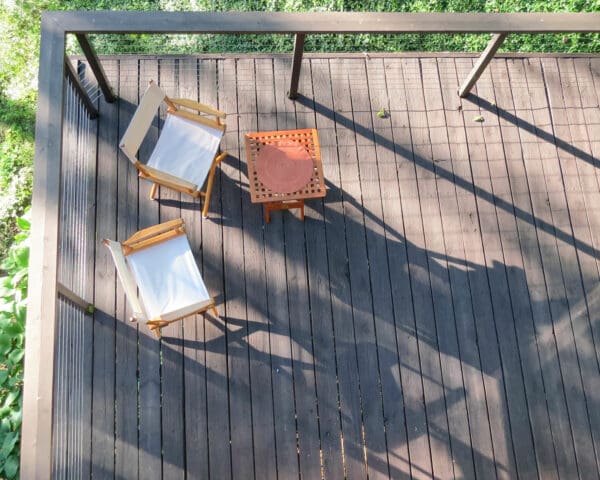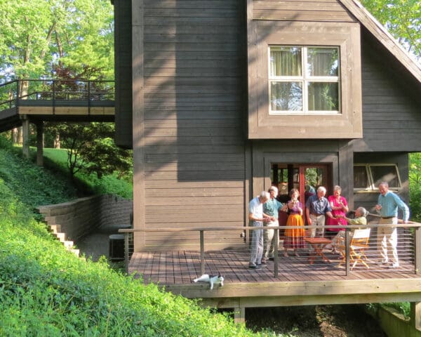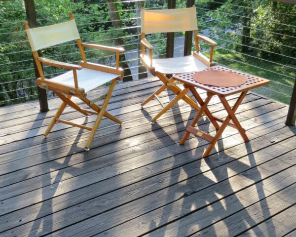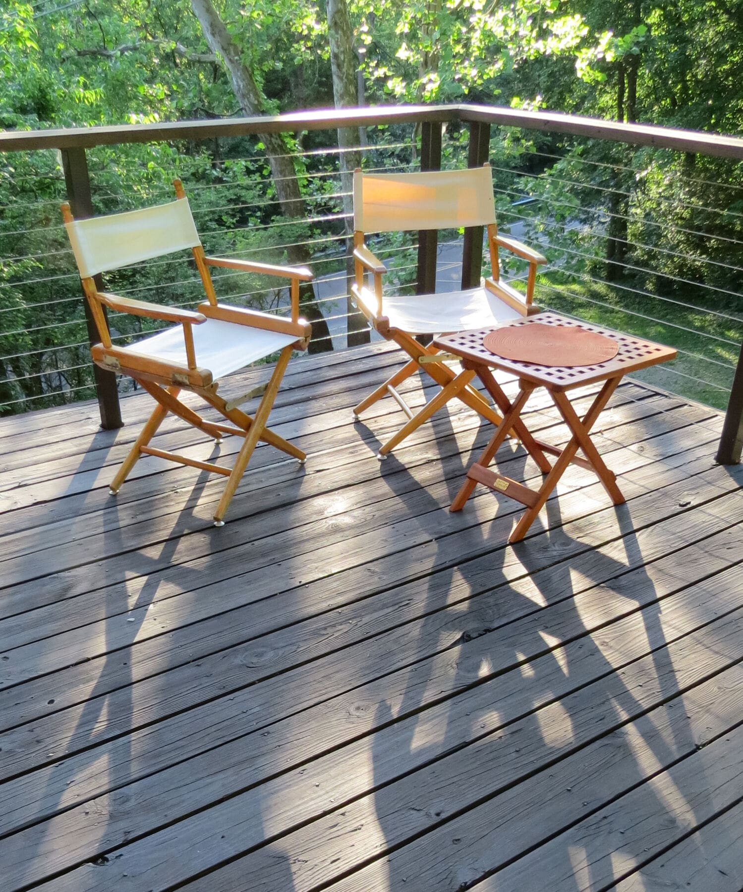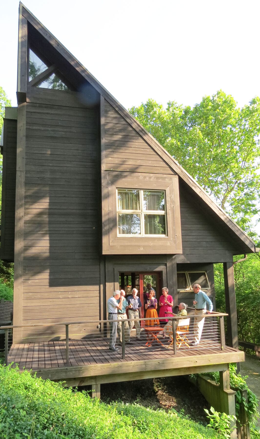 The style and color of our railing blends beautifully with the earthy tones and wood plank siding of this forested house in the hills of Ohio.