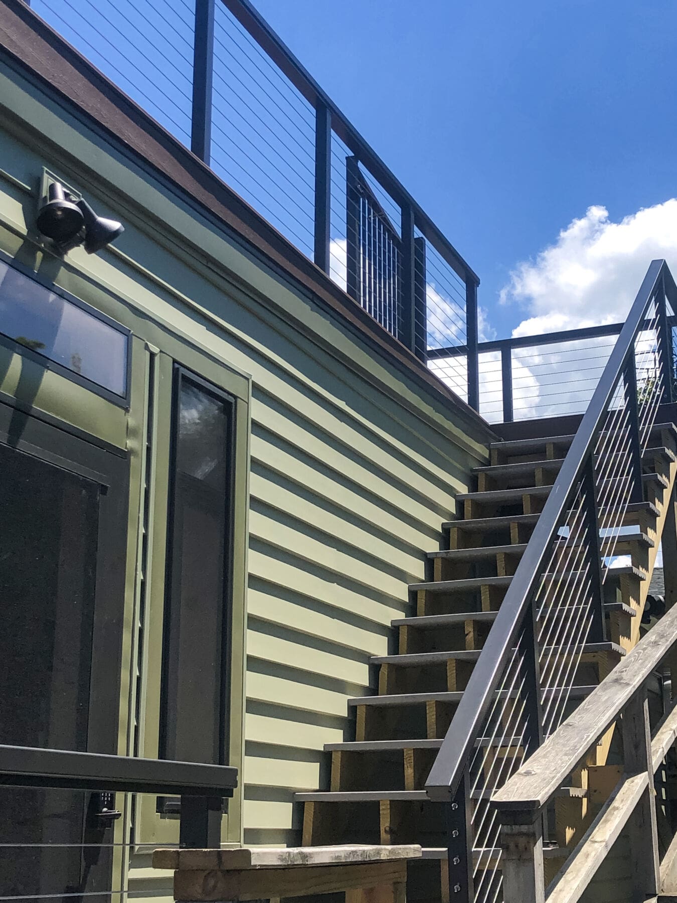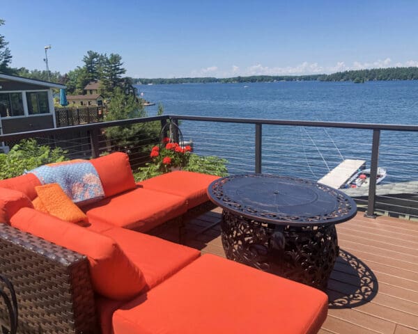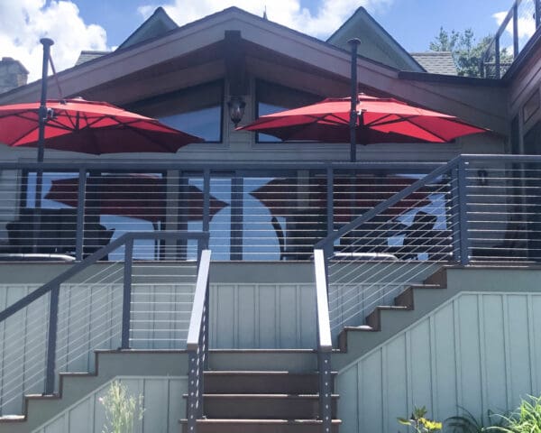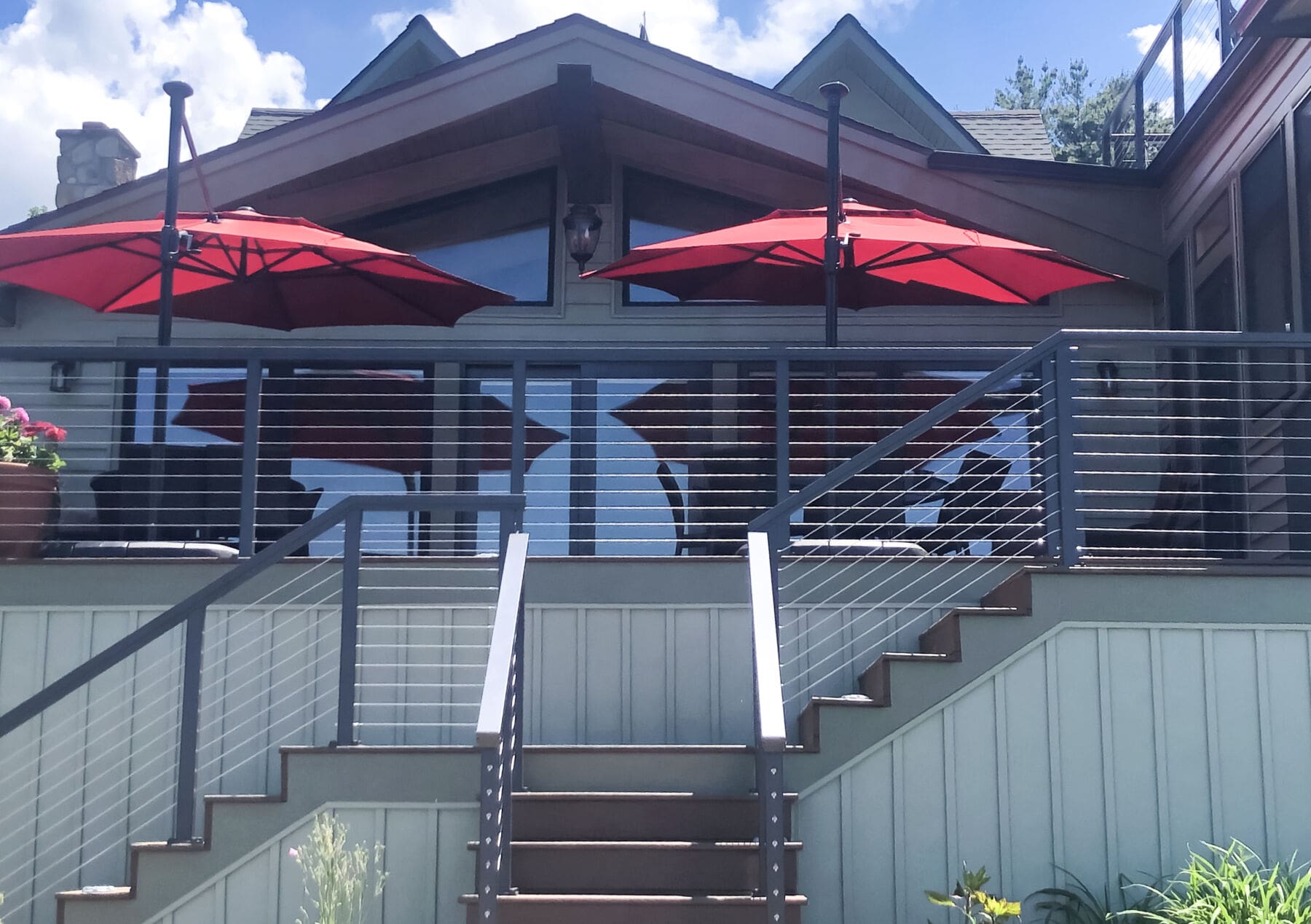 Cable railing lines the multiple decks and connecting staircases of this beautiful waterside house in Alexandria Bay, NY. The bronze powder coat complements lush plant life and rustic garden features, while the open design and cable infill preserve the view with a contemporary flair.