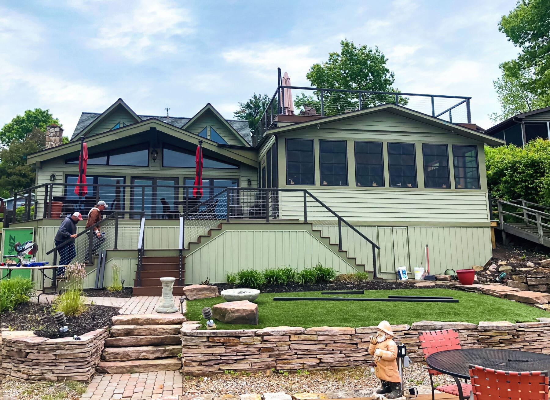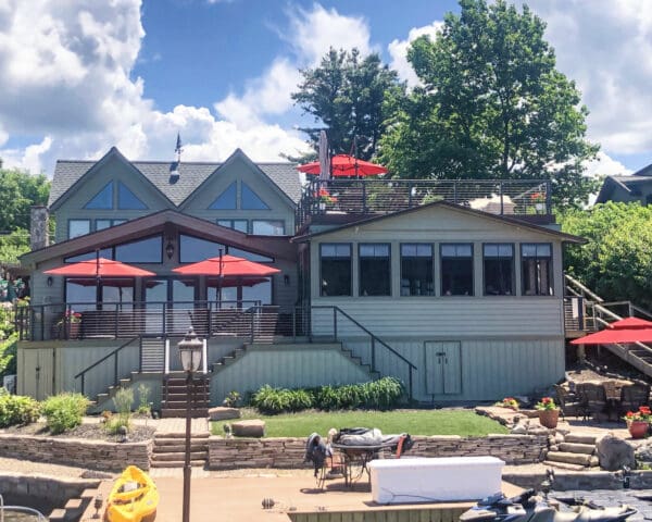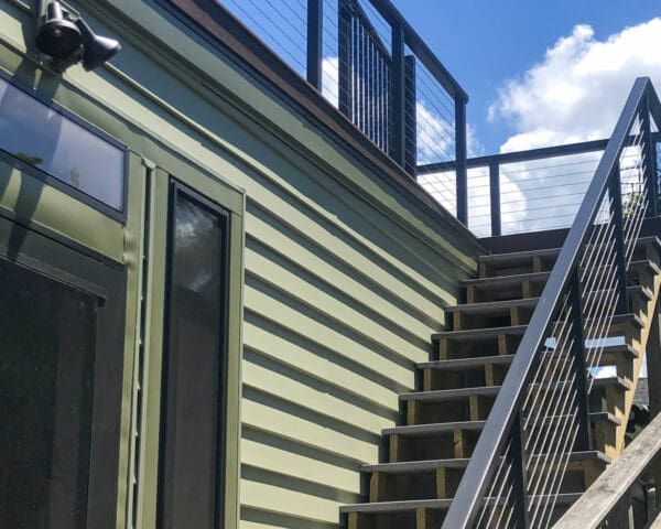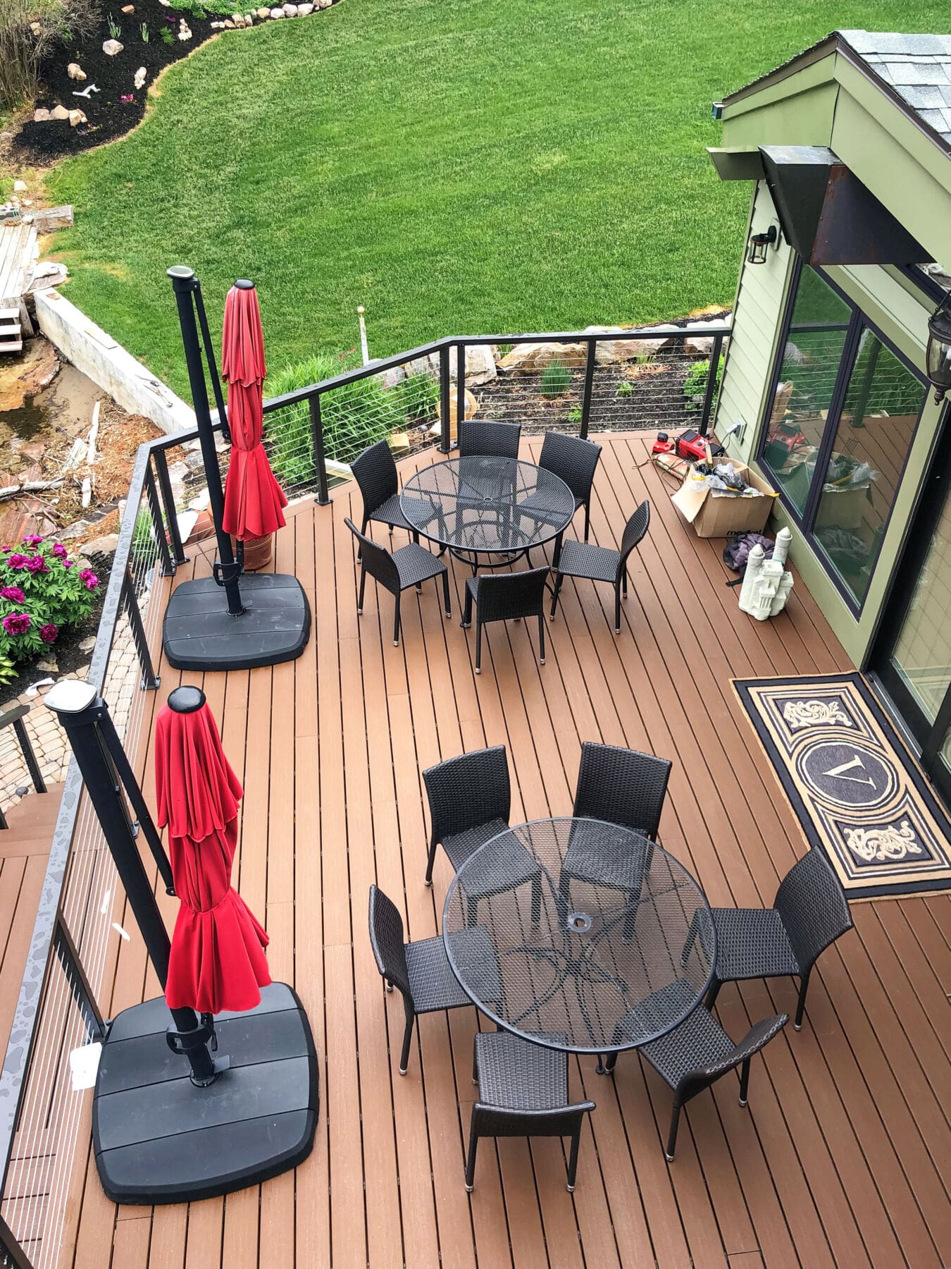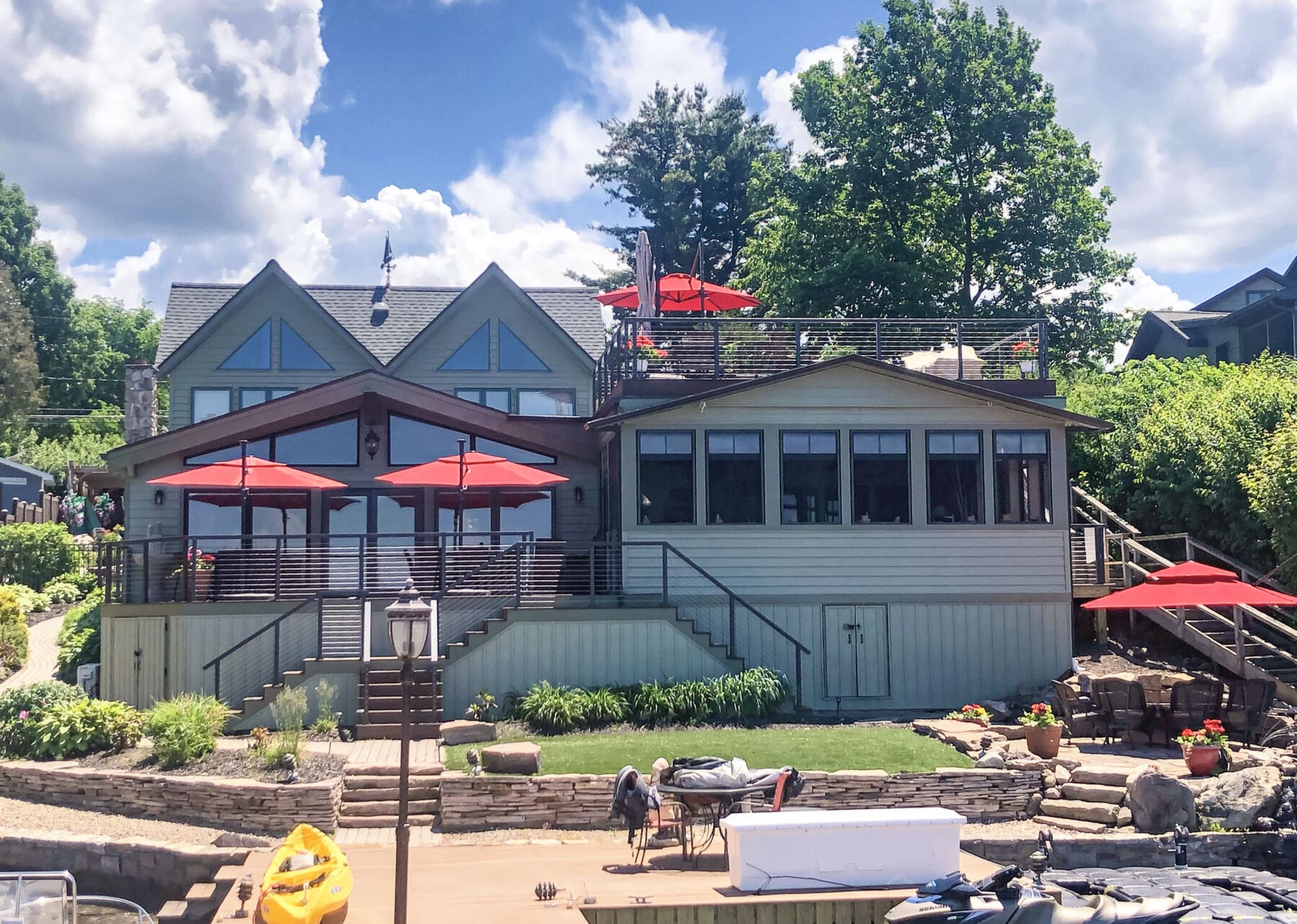 Cable railing lines the multiple decks and connecting staircases of this beautiful waterside house in Alexandria Bay, NY. The bronze powder coat complements lush plant life and rustic garden features, while the open design and cable infill preserve the view with a contemporary flair.