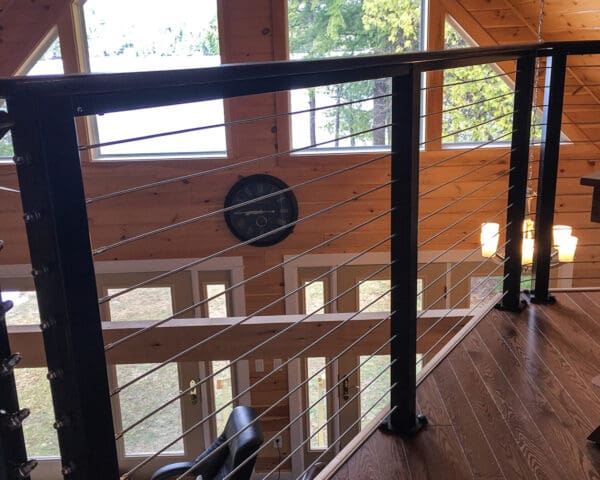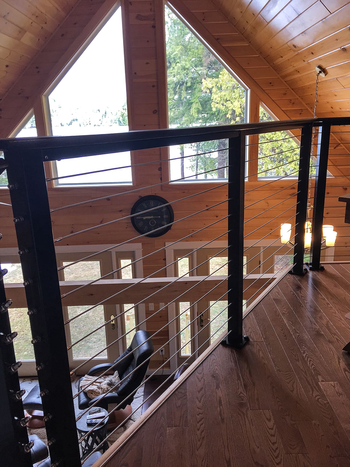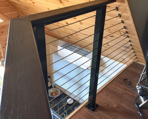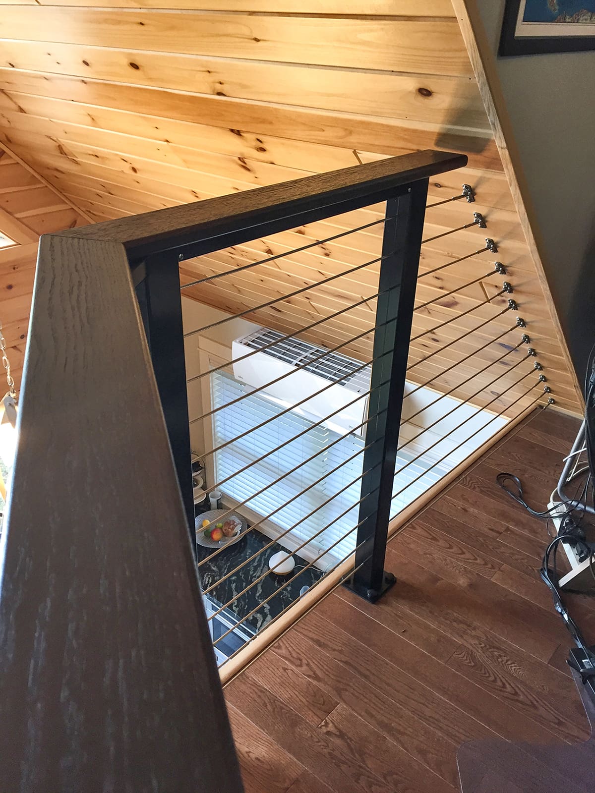 This black aluminum railing provides stylish safety for the stair and loft area of this modern, rustic cabin. The dark color matches other black metal furnishings and stands out nicely against an earthy backdrop of stone and wood. Surface Mount Toggle assemblies are used to secure the cables to the A-frame ceiling in the loft area.