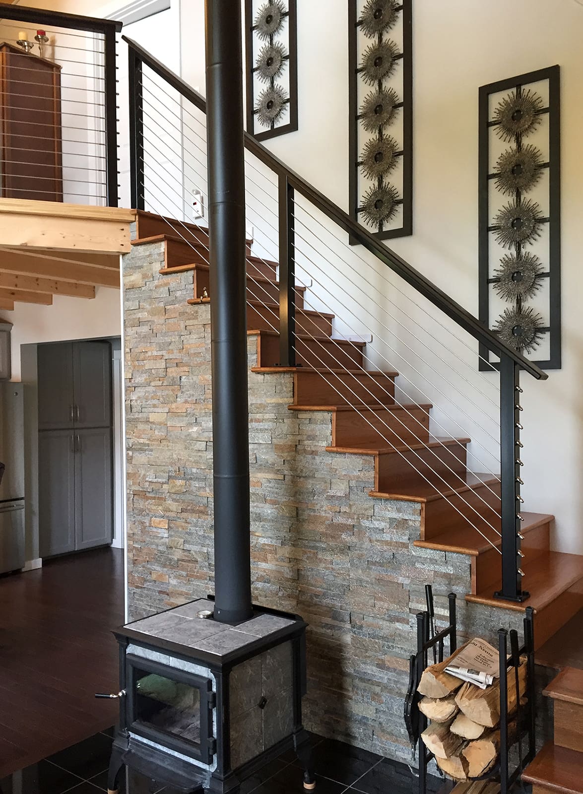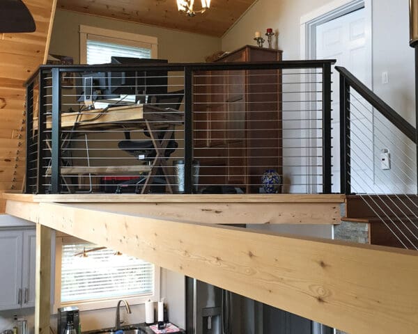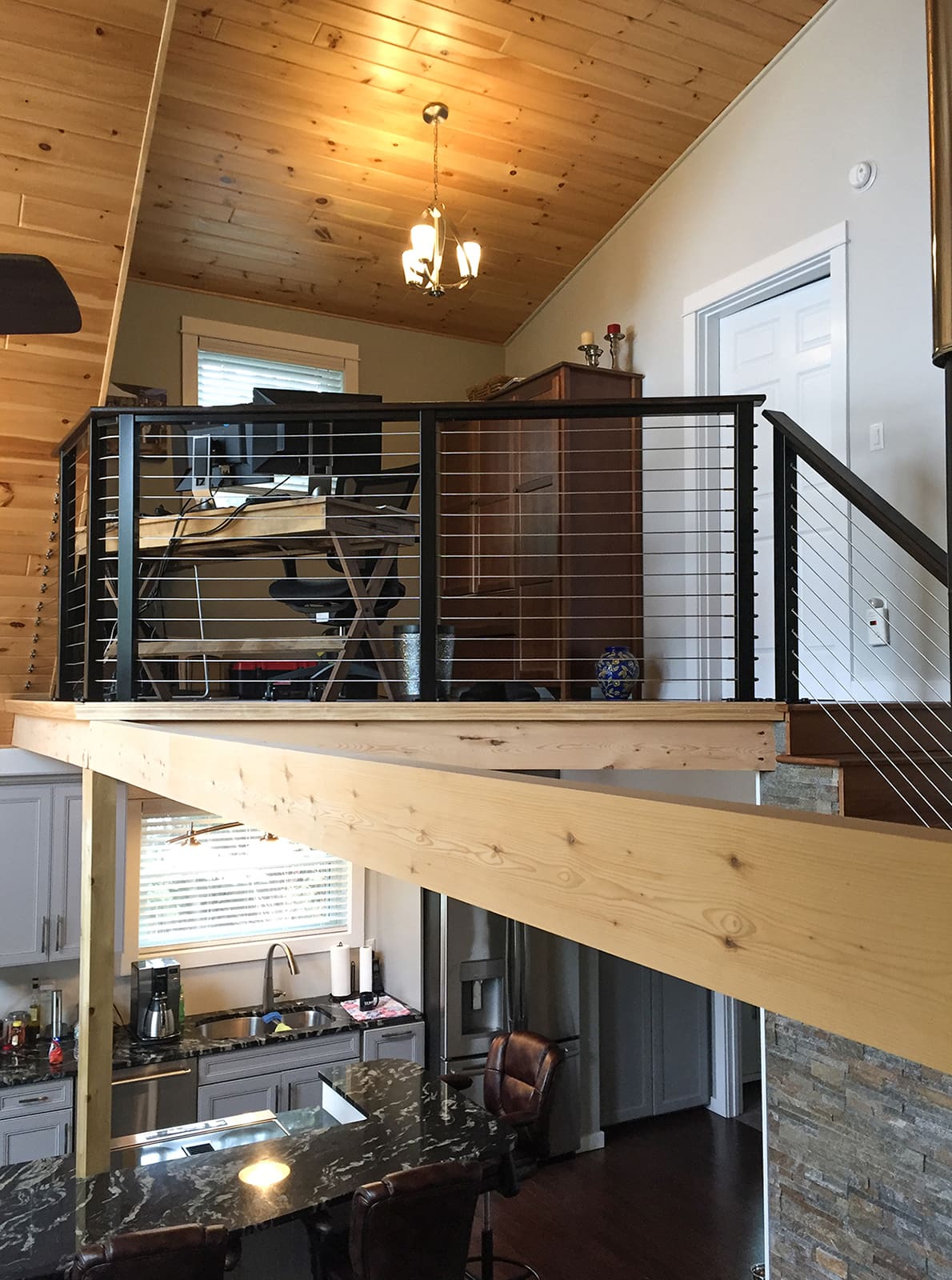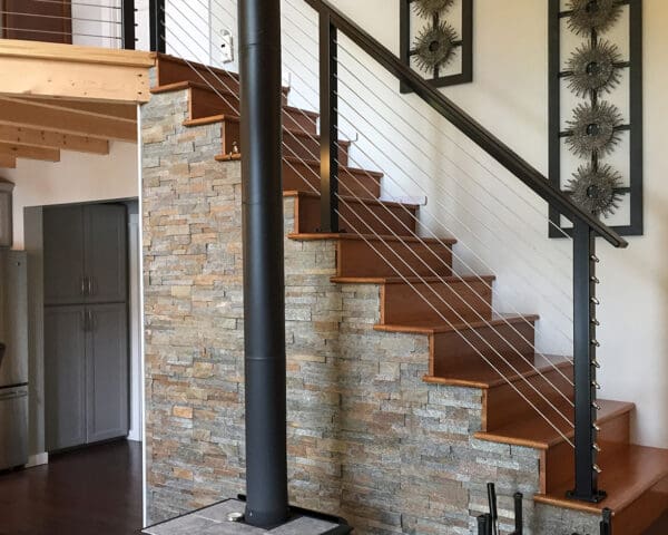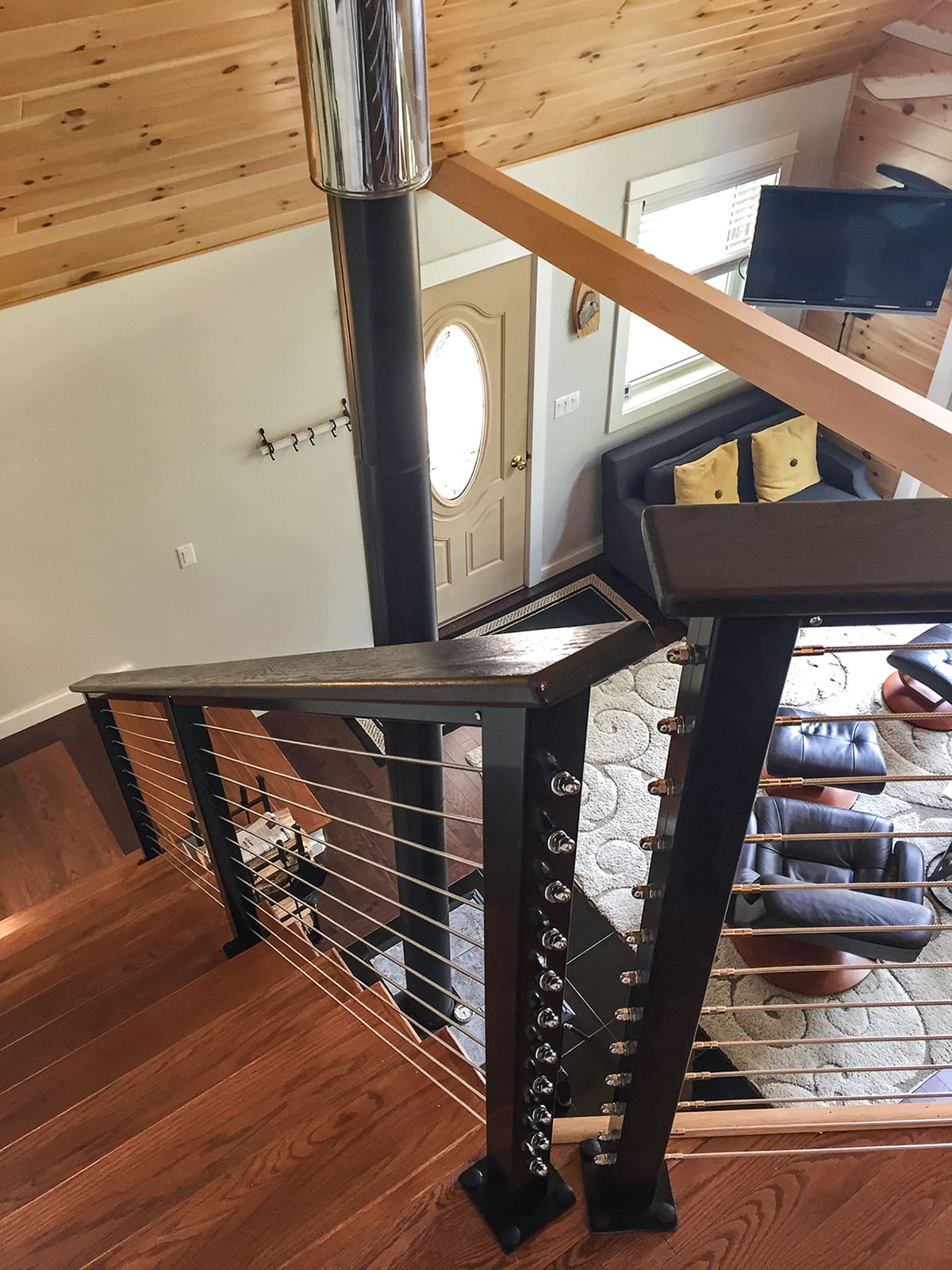 This black aluminum railing provides stylish safety for the stair and loft area of this modern, rustic cabin. The dark color matches other black metal furnishings and stands out nicely against an earthy backdrop of stone and wood. Surface Mount Toggle assemblies are used to secure the cables to the A-frame ceiling in the loft area.