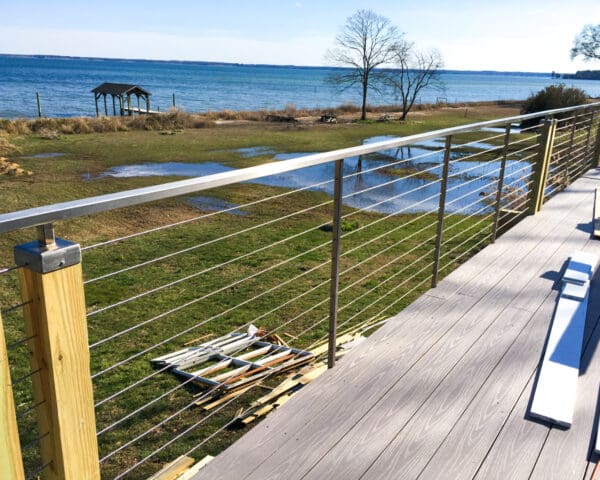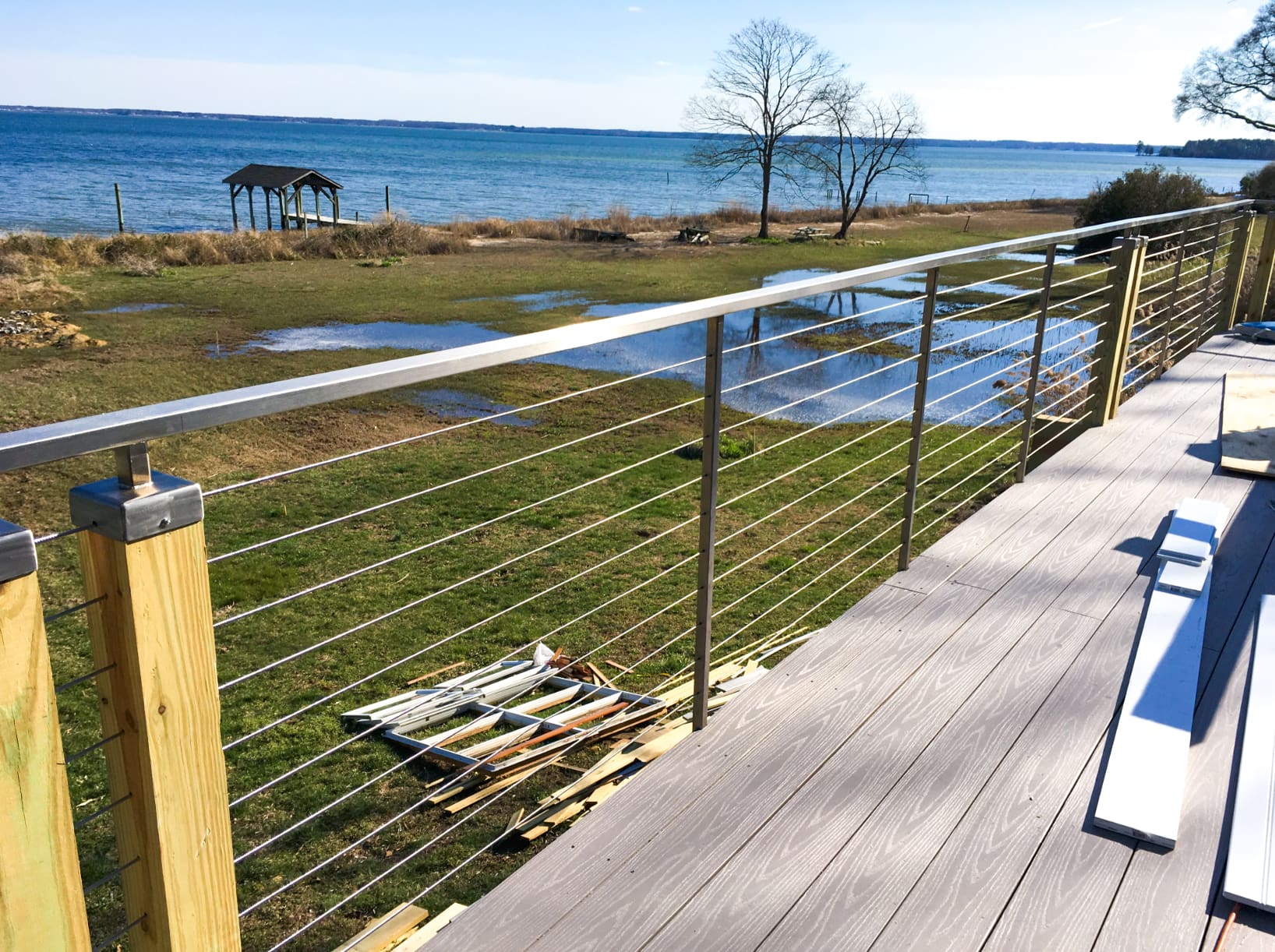 A new deck overlooks open water in this Virginian backyard. Cable infill offers protection without blocking the view.