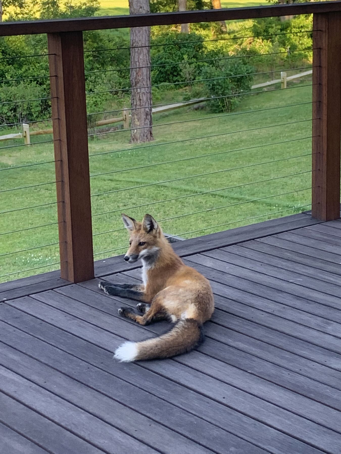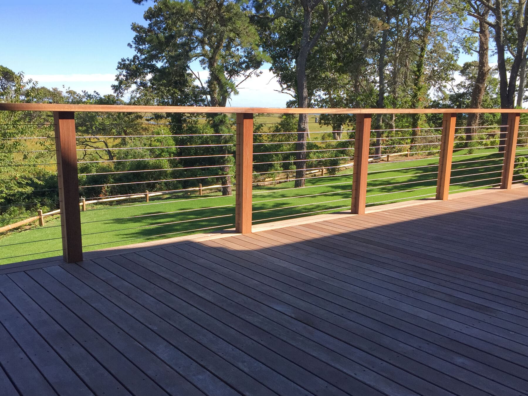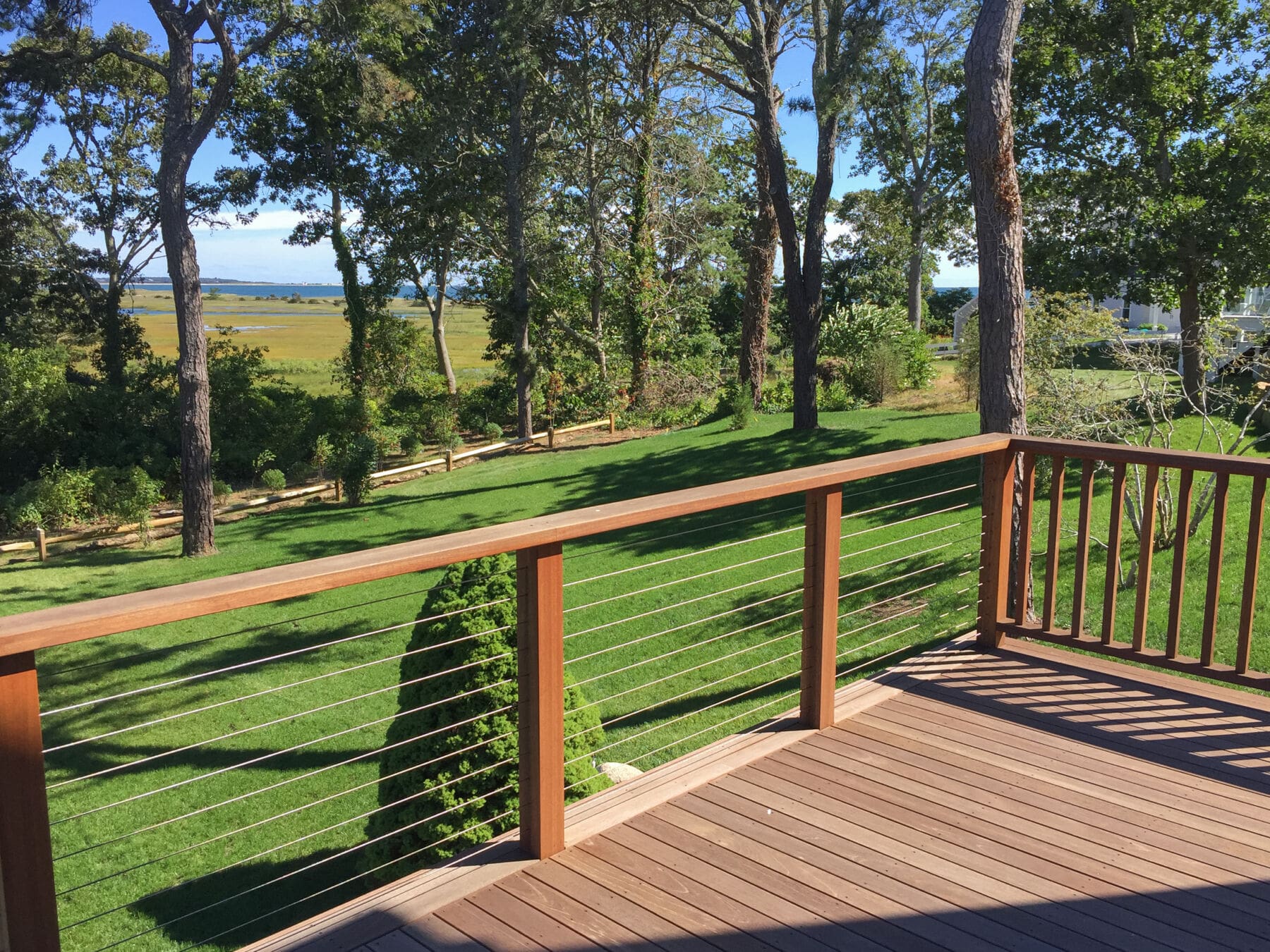The view from this long deck overlooking the landscape of Chatham, MA is so tempting, even the wildlife can't help but lounge and enjoy. A simple wood cable railing blurs the boundaries between home and nature while providing necessary safety for all guests, including furry ones!
