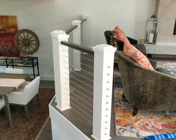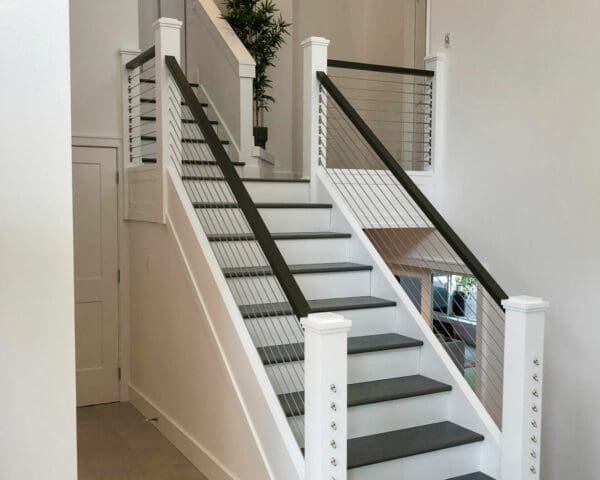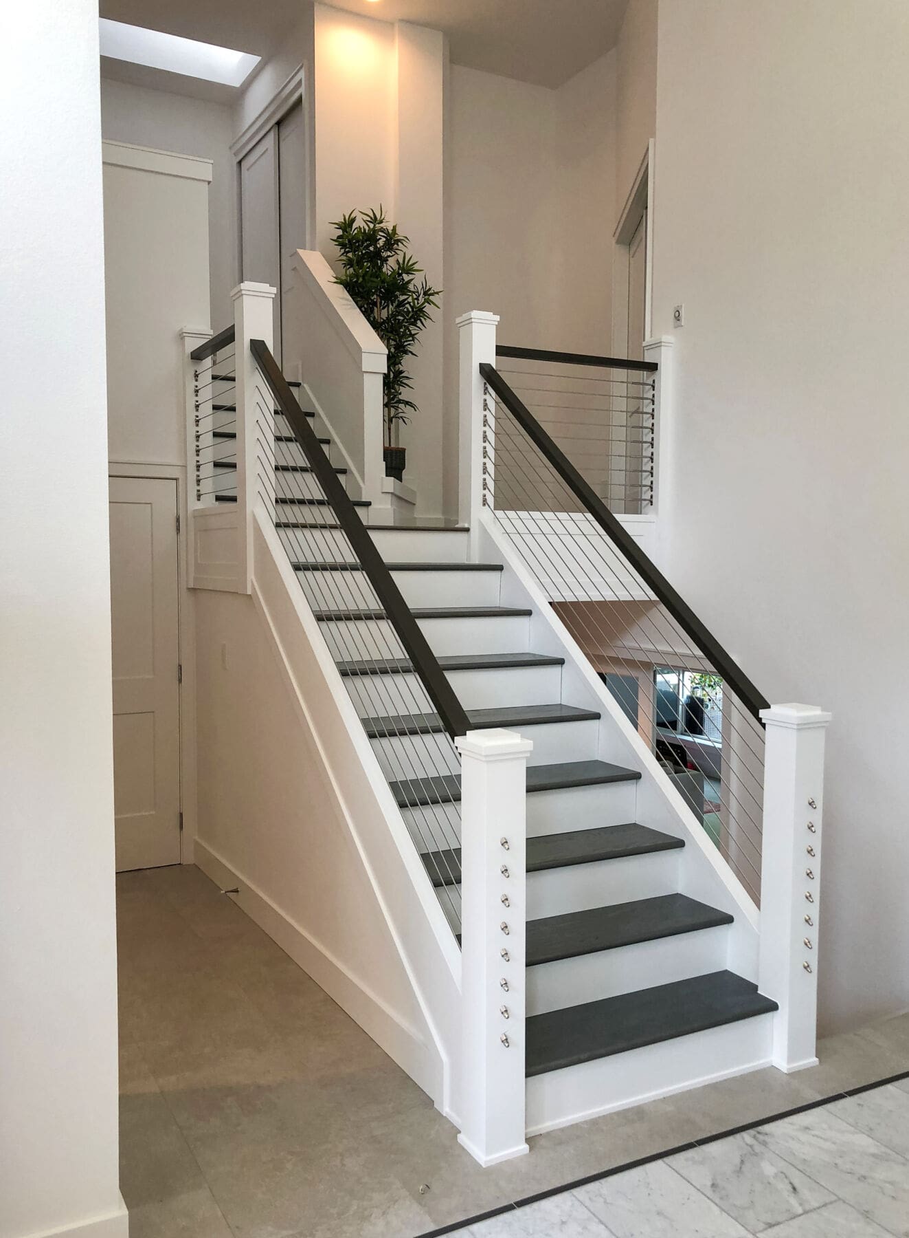 Cable railing hardware opens up and brightens this staircase and foyer. Unlike pickets, cables create clean horizontal lines that build a path for the eye to follow, making the space seem larger than it is and highlighting key home features, like the skylight and unique floorplan seen here. When choosing what railing to use for your home, consider the impression you'd like your staircase to make. Cable infill creates a lasting impression without feeling overwhelming.