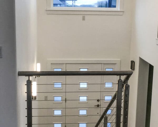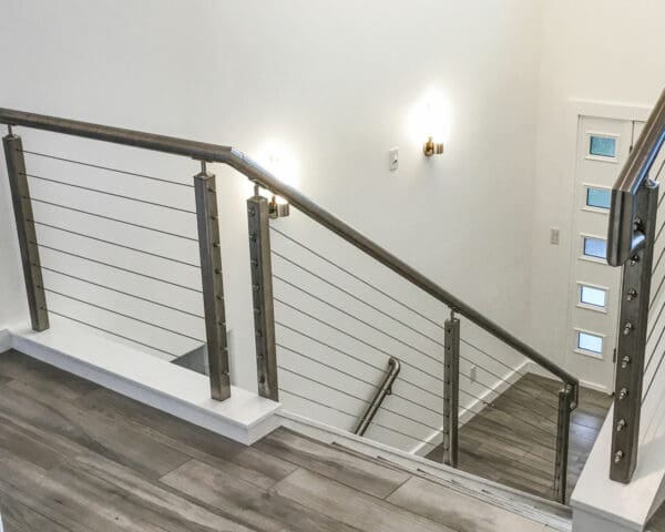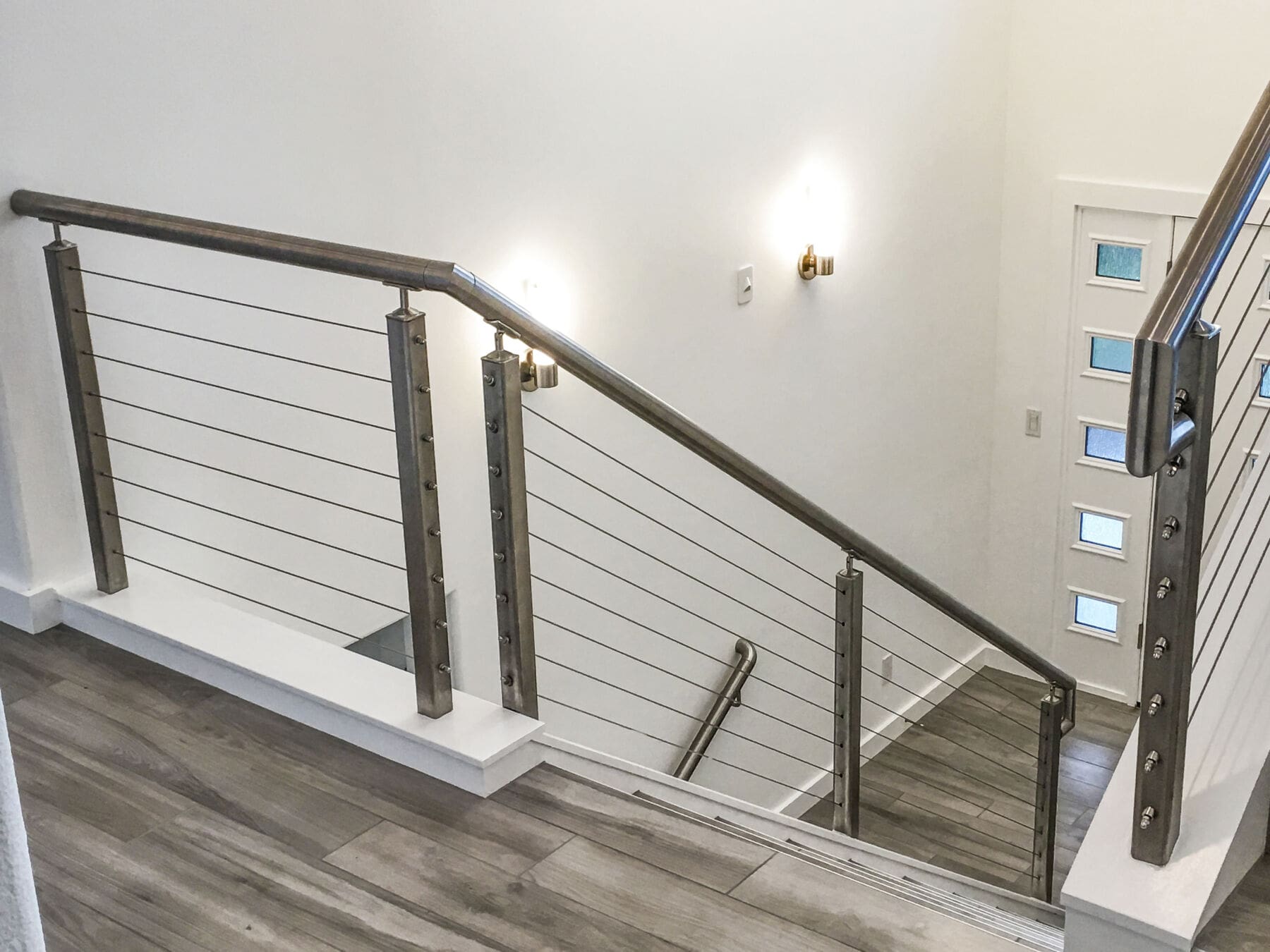 Combining the industrial look of our more angular stainless square posts with the smooth pipe-shape of our stainless round top rail, these entry and living room staircases offer a bold look and maintain a sense of flow and connectivity between the different areas of the house.