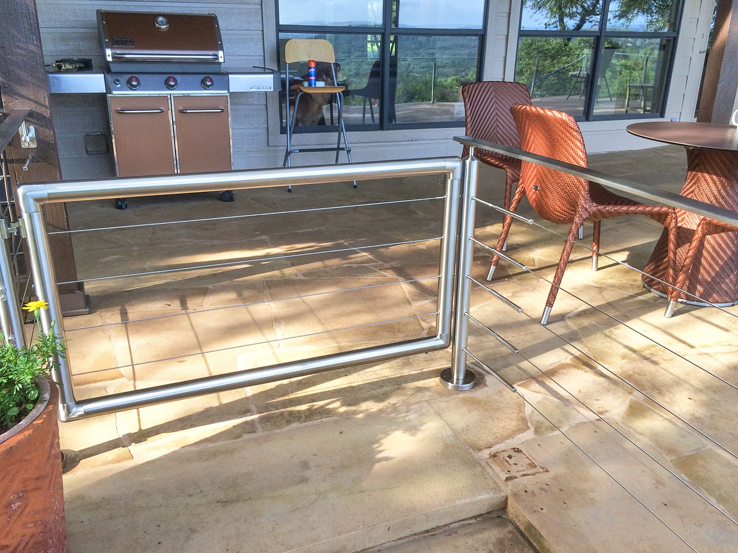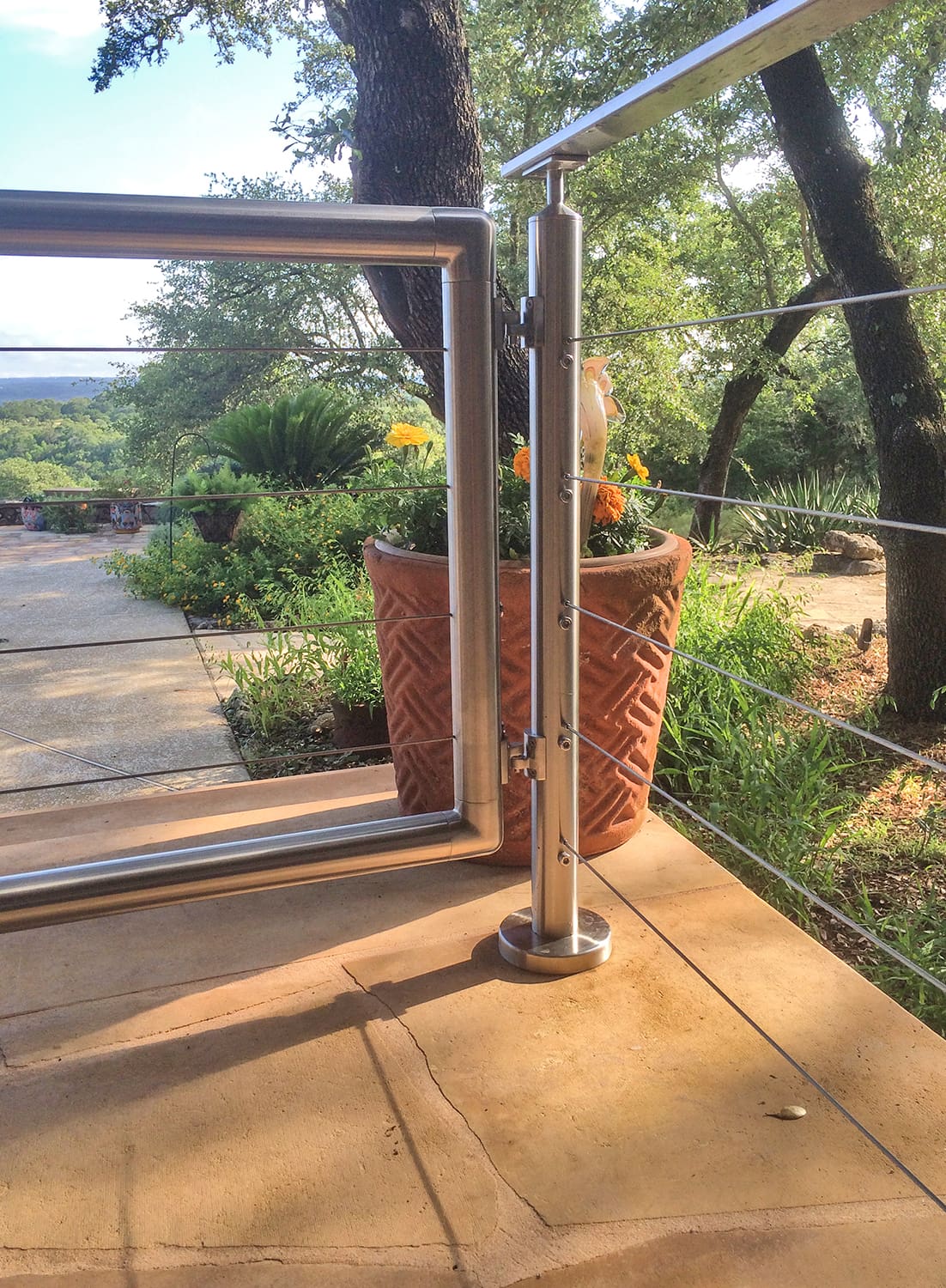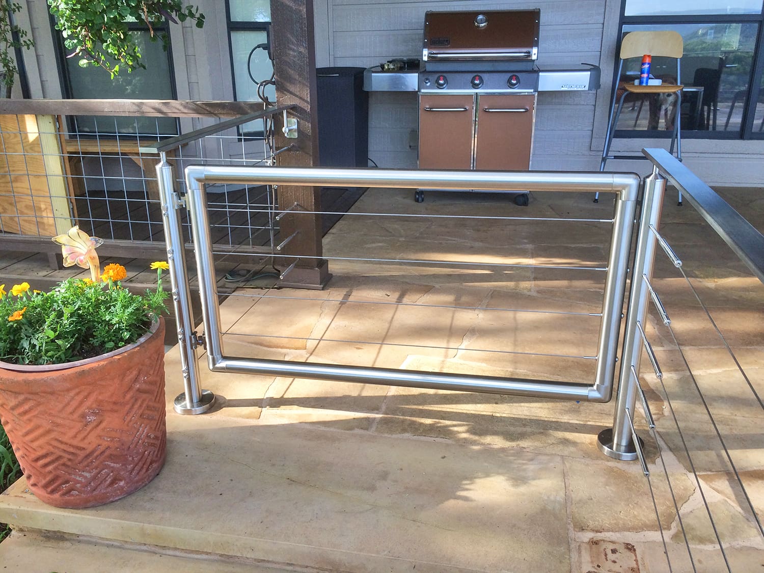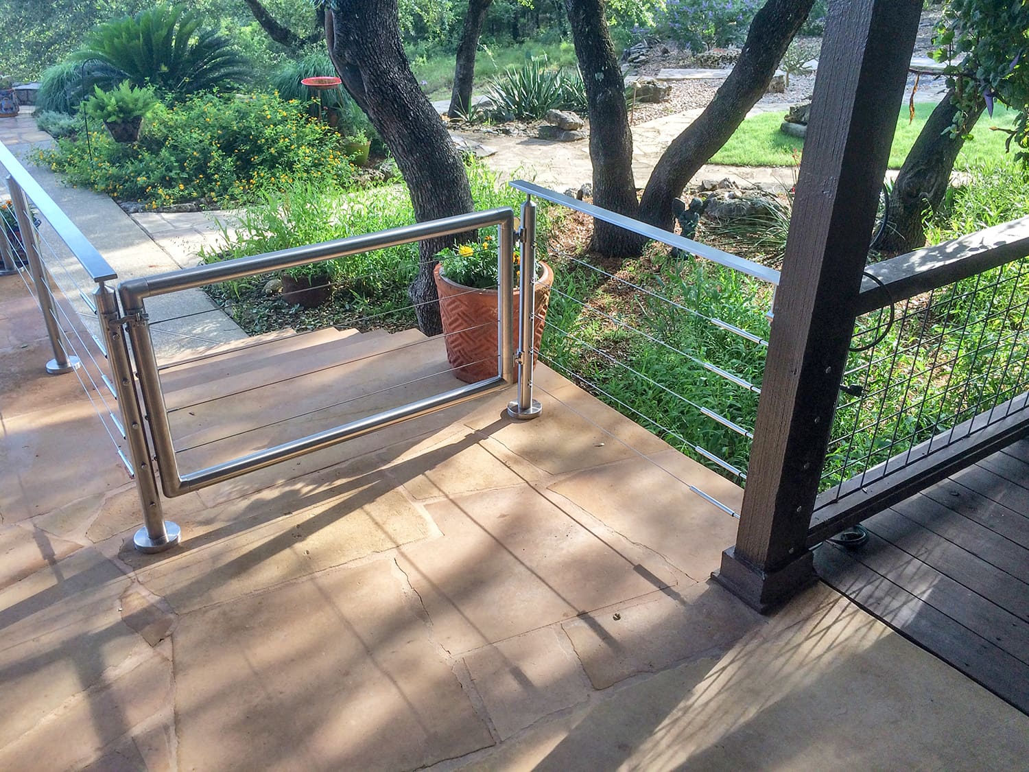 - Stainless Round Cable Railing Gate closes off the elevated area while perfectly matching the rest of the system.