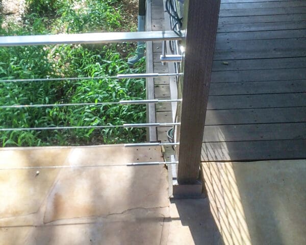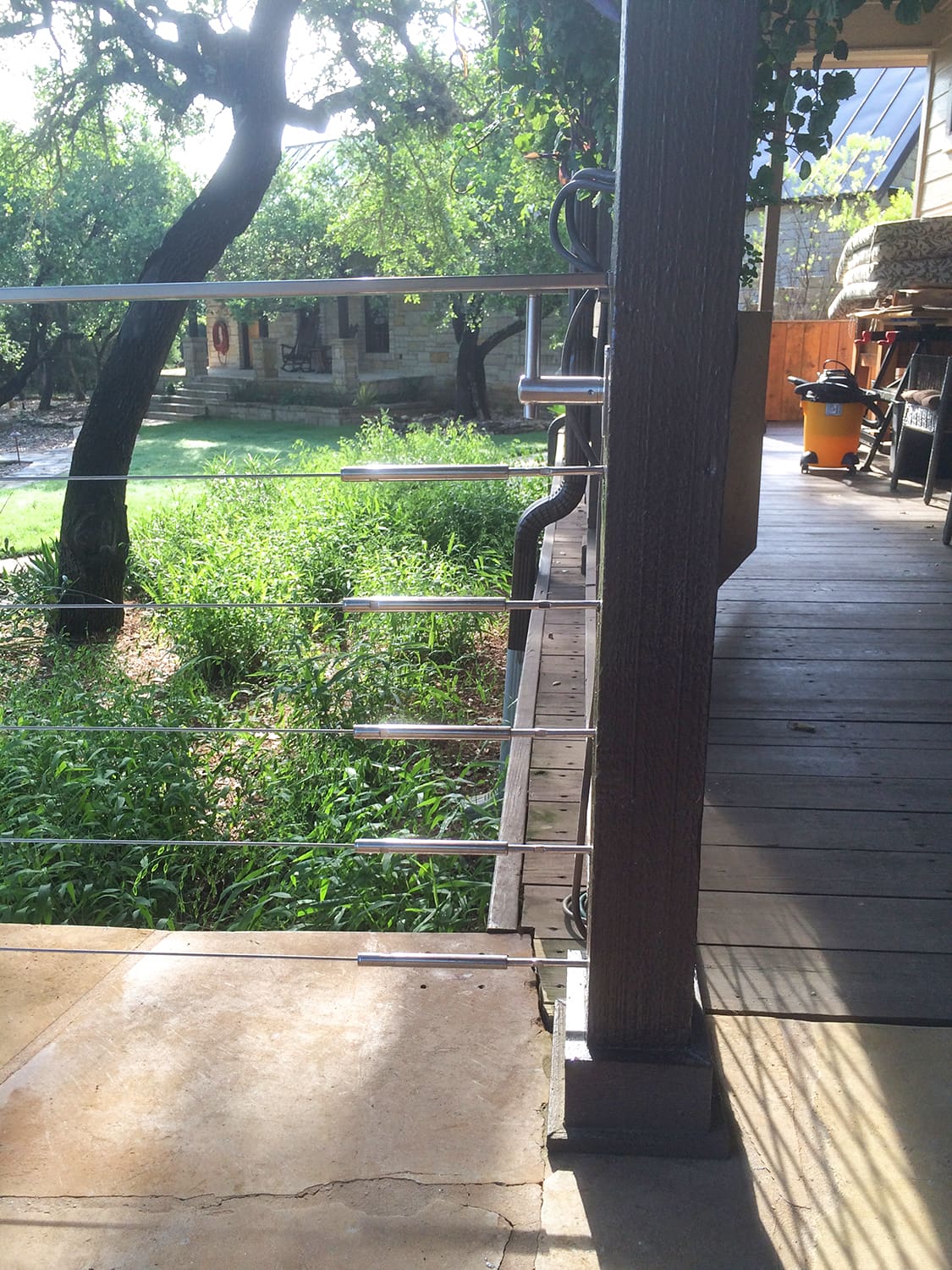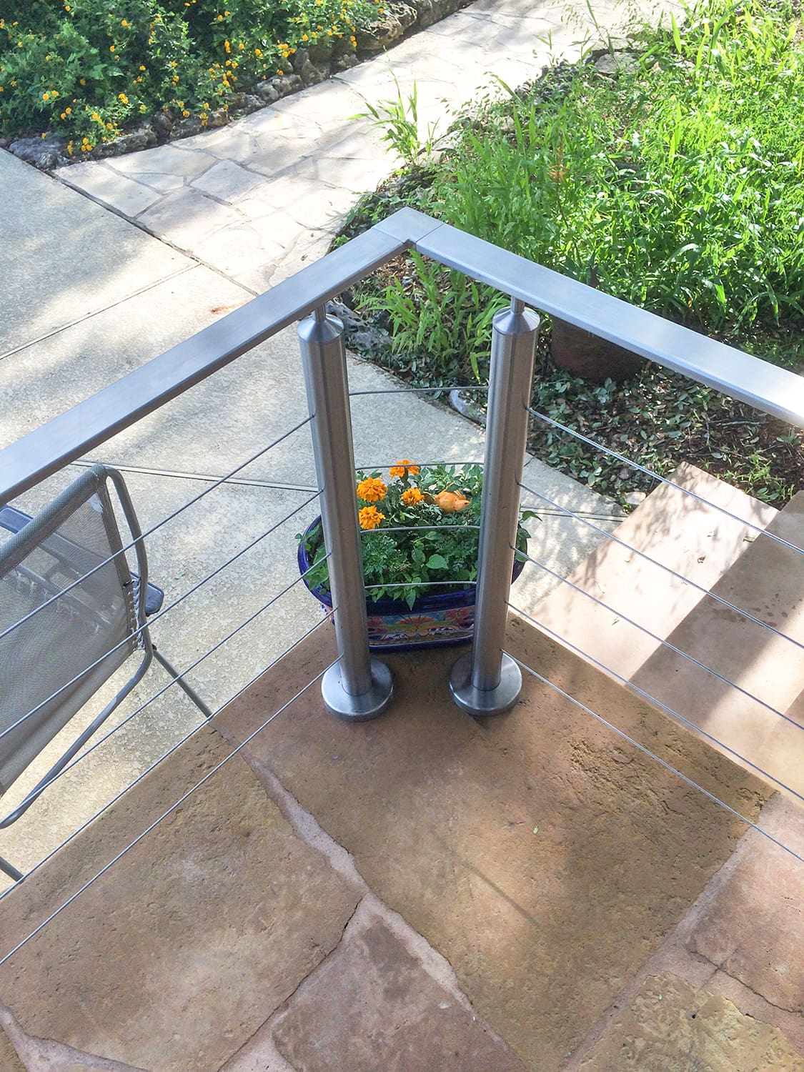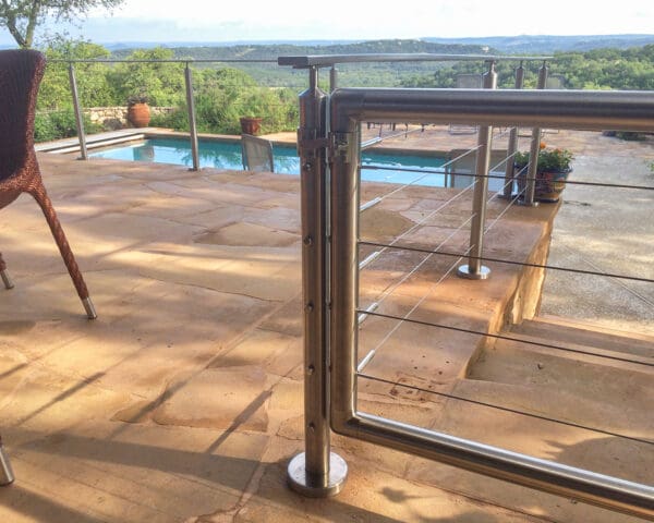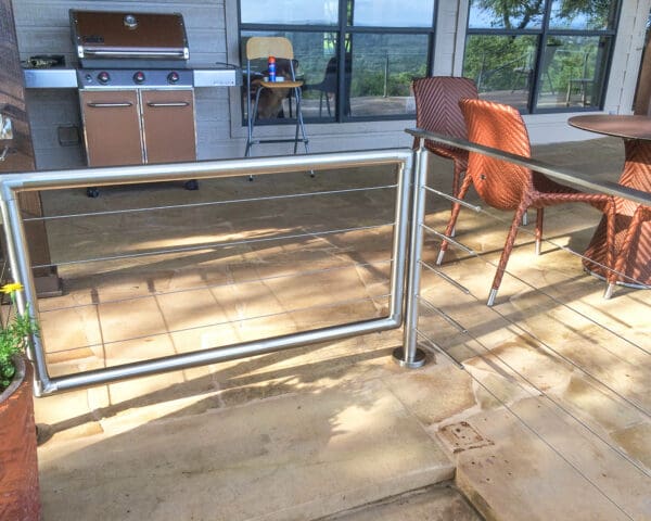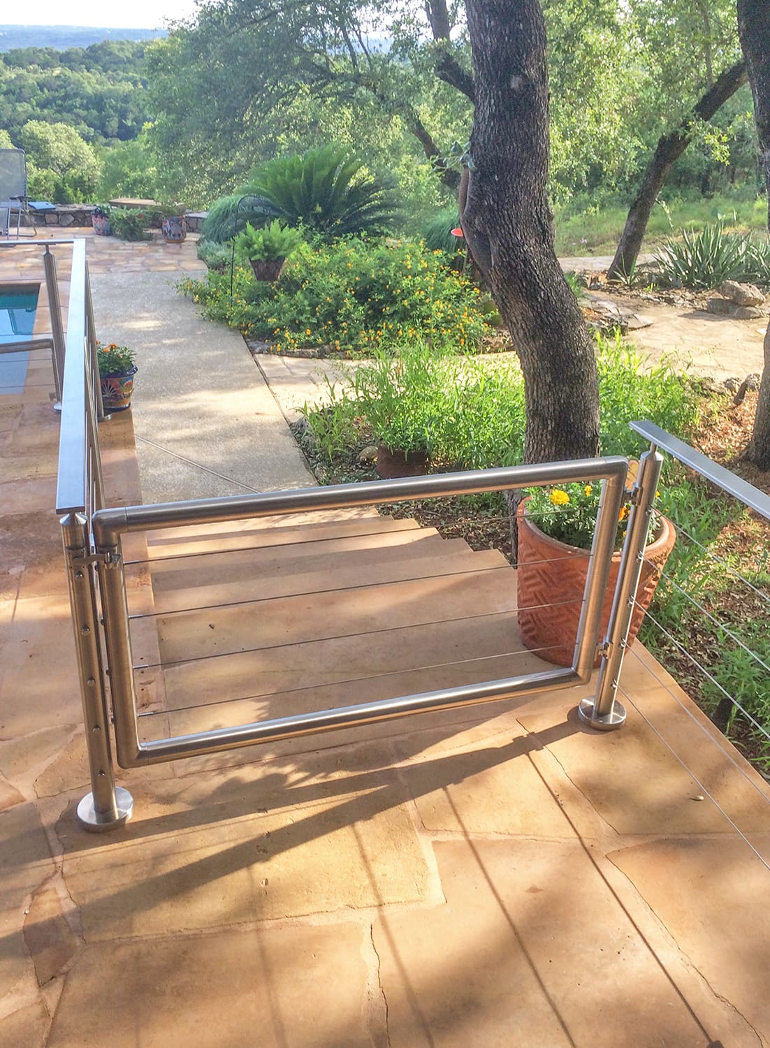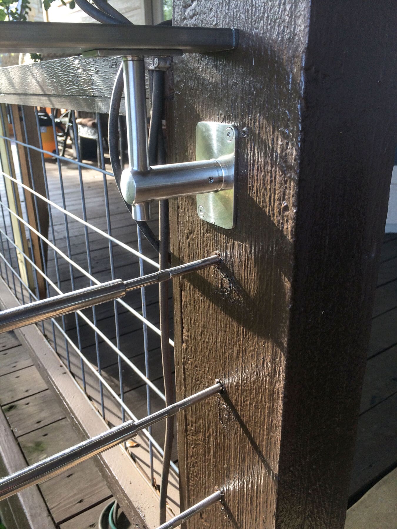 - Stainless Round Cable Railing Gate closes off the elevated area while perfectly matching the rest of the system.