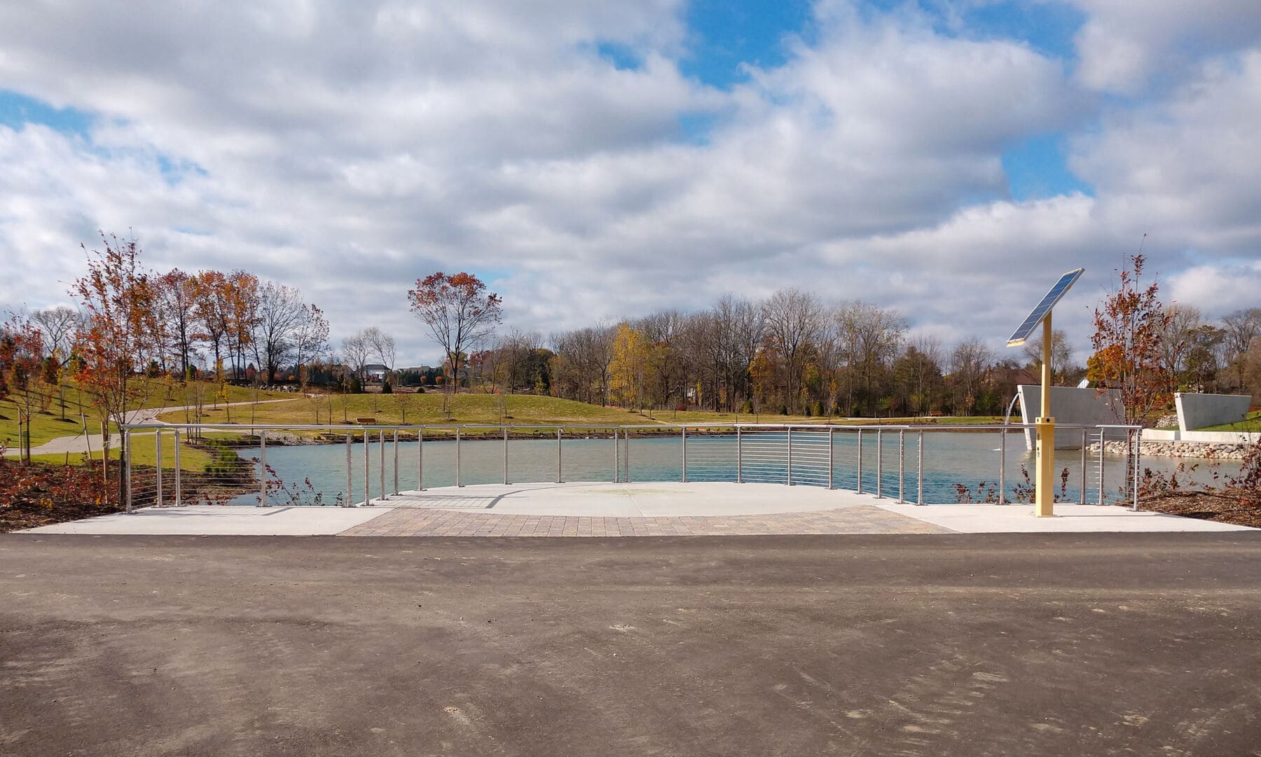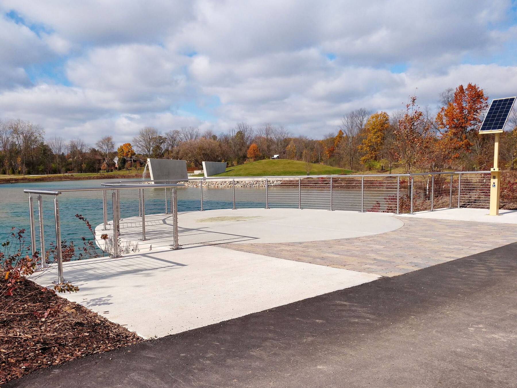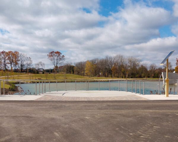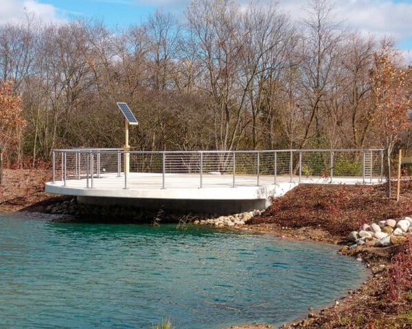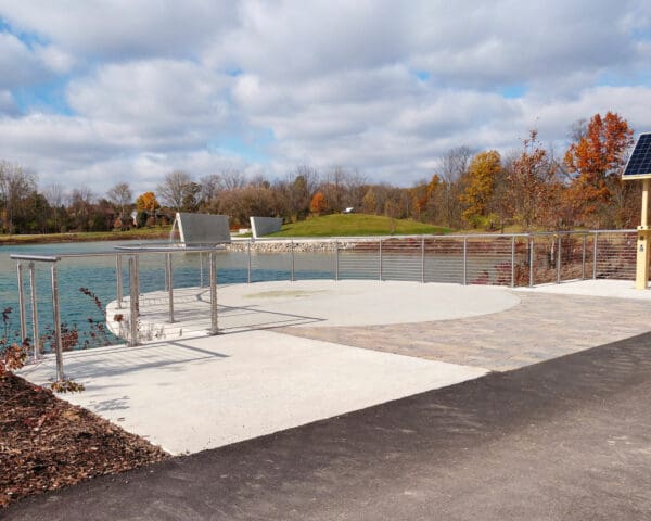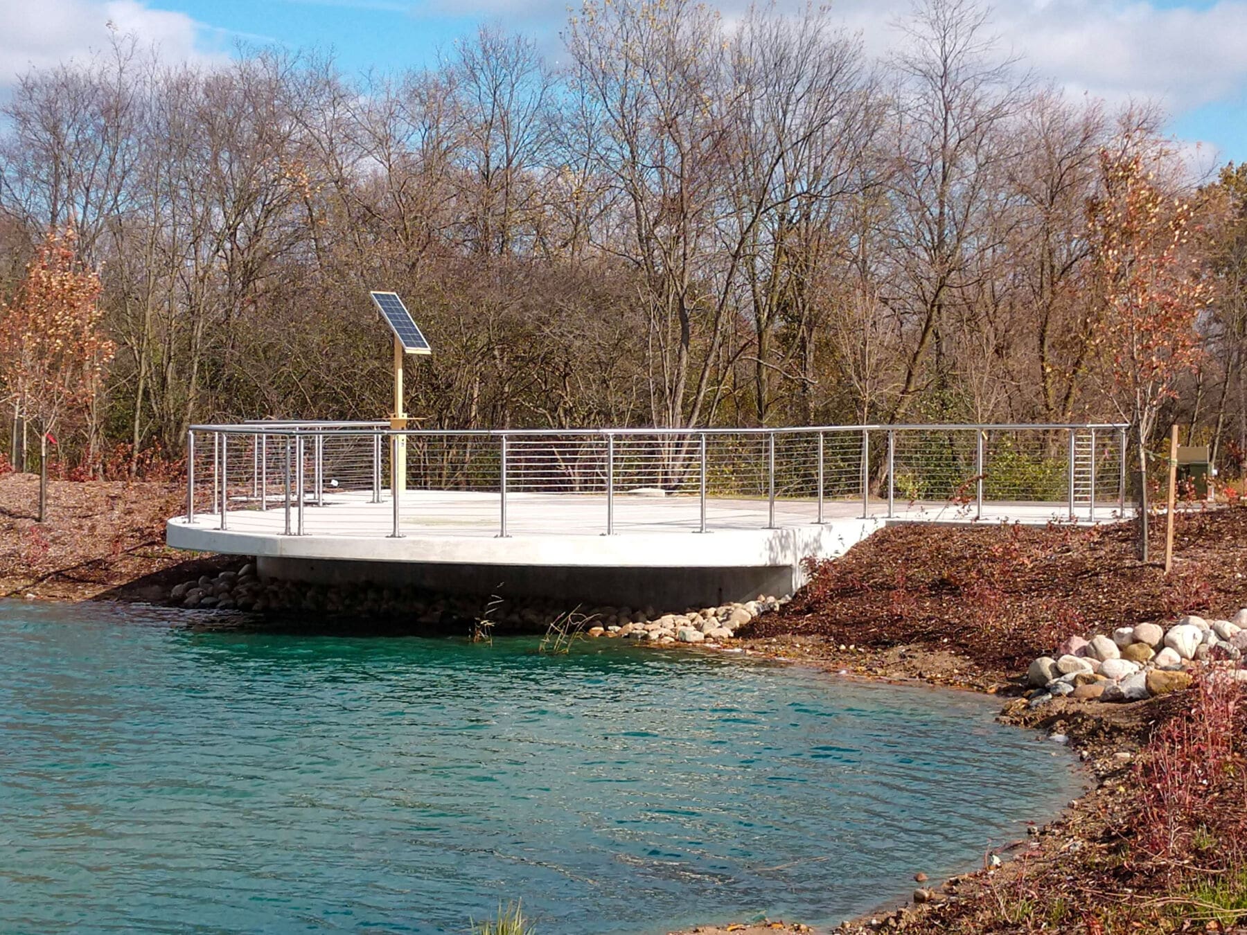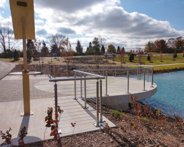 Round stainless steel railing creates a welcoming scene against this crystal blue pond. Park visitors can safely overlook and enjoy the scenery.