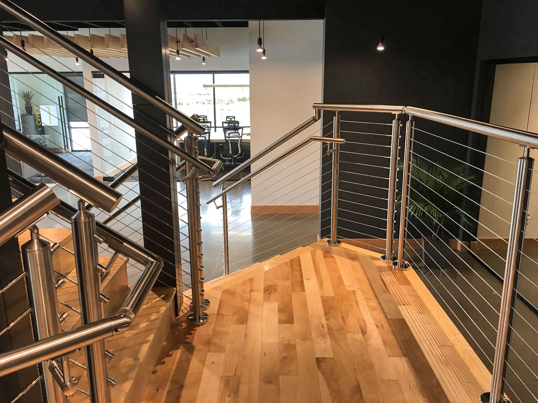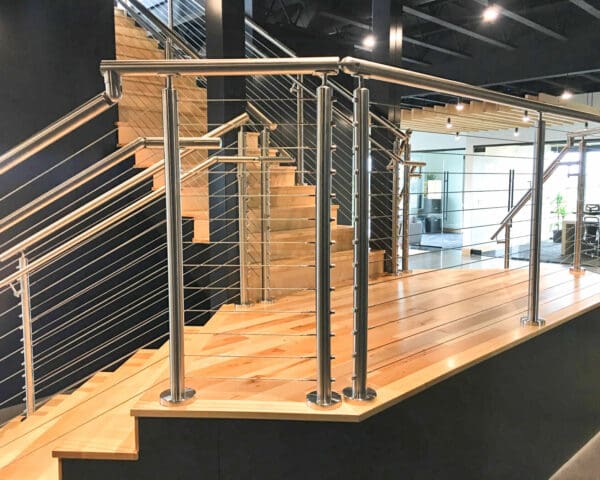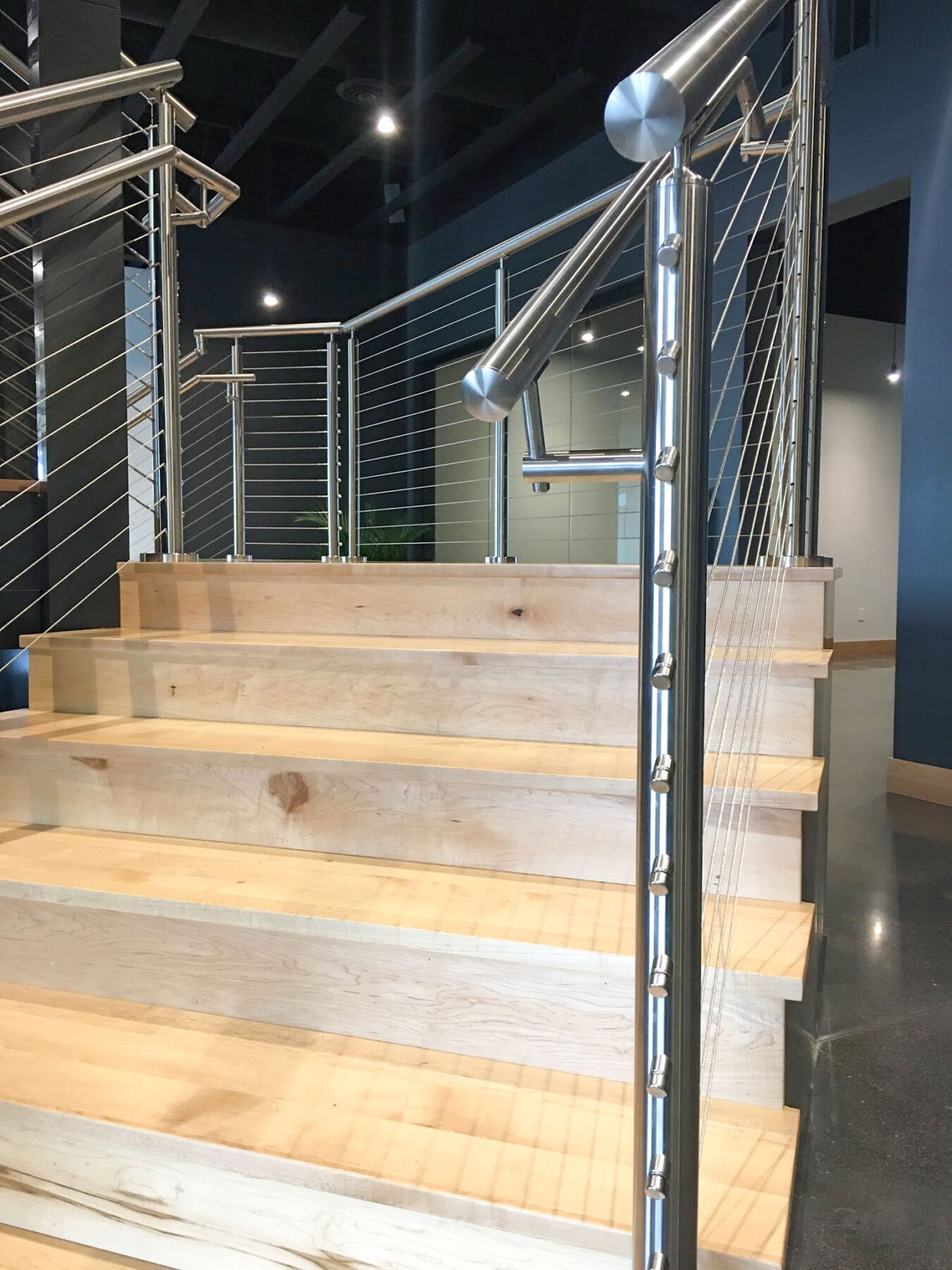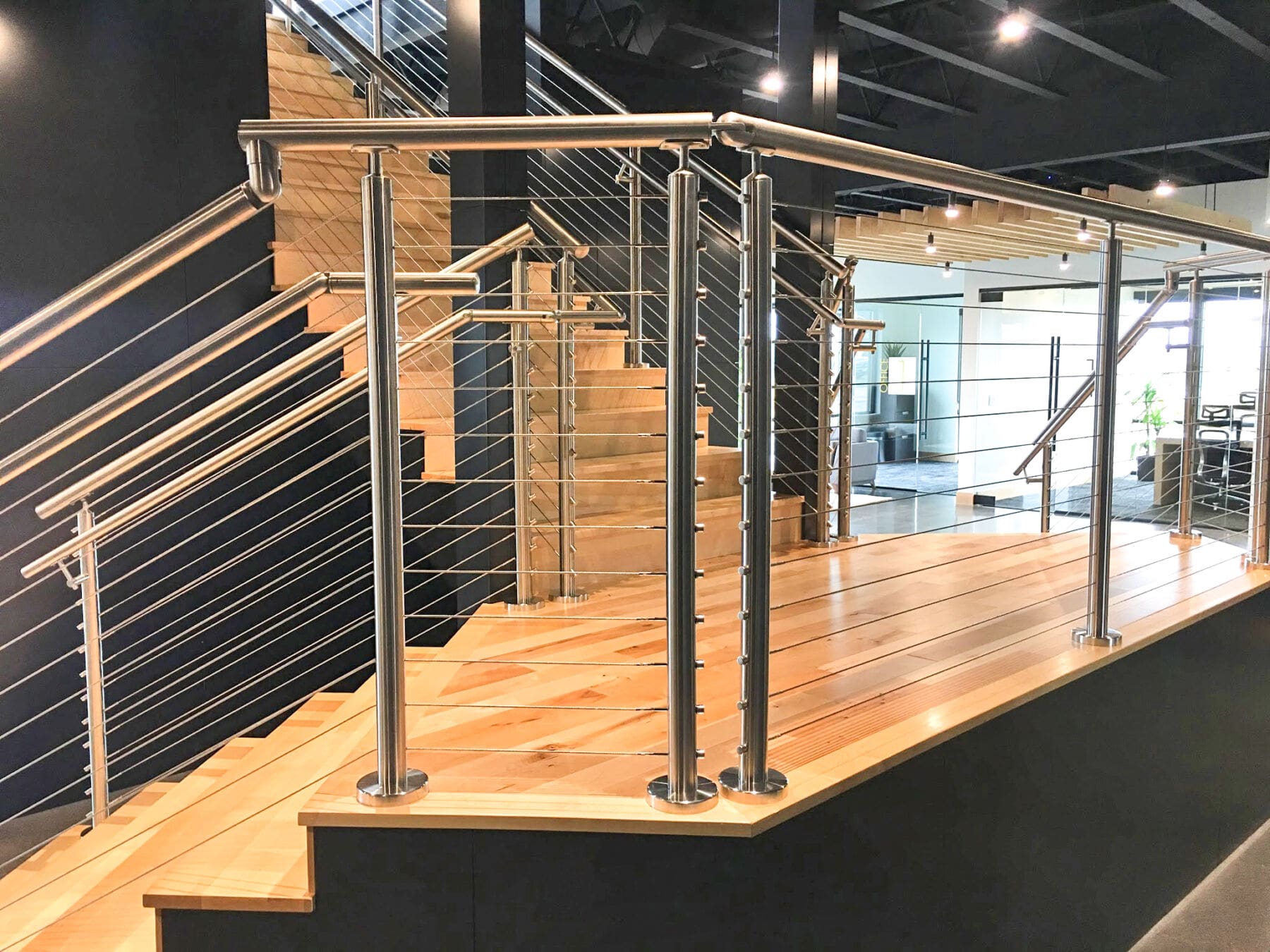 Our round stainless steel cable railing system was chosen for a staircase in this particularly chic Kennewick, Washington building. The round shape softens rectangular surroundings and catches the light beautifully.