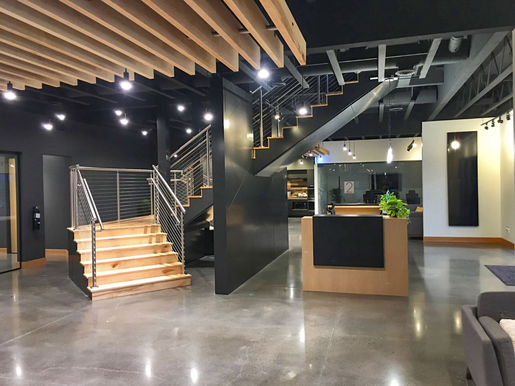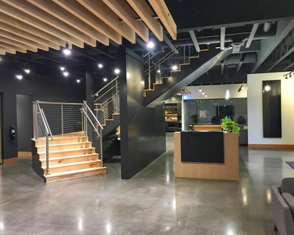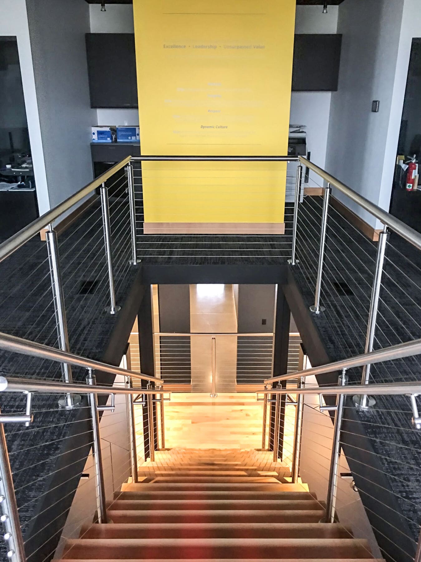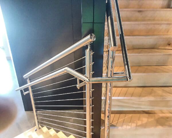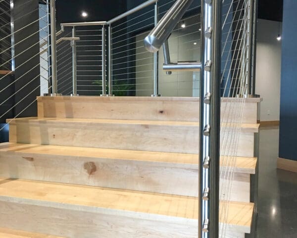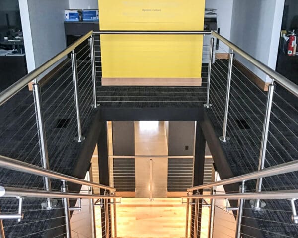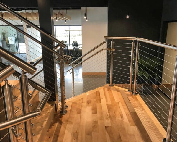 Our round stainless steel cable railing system was chosen for a staircase in this particularly chic Kennewick, Washington building. The round shape softens rectangular surroundings and catches the light beautifully.