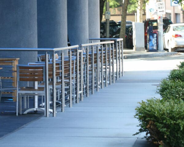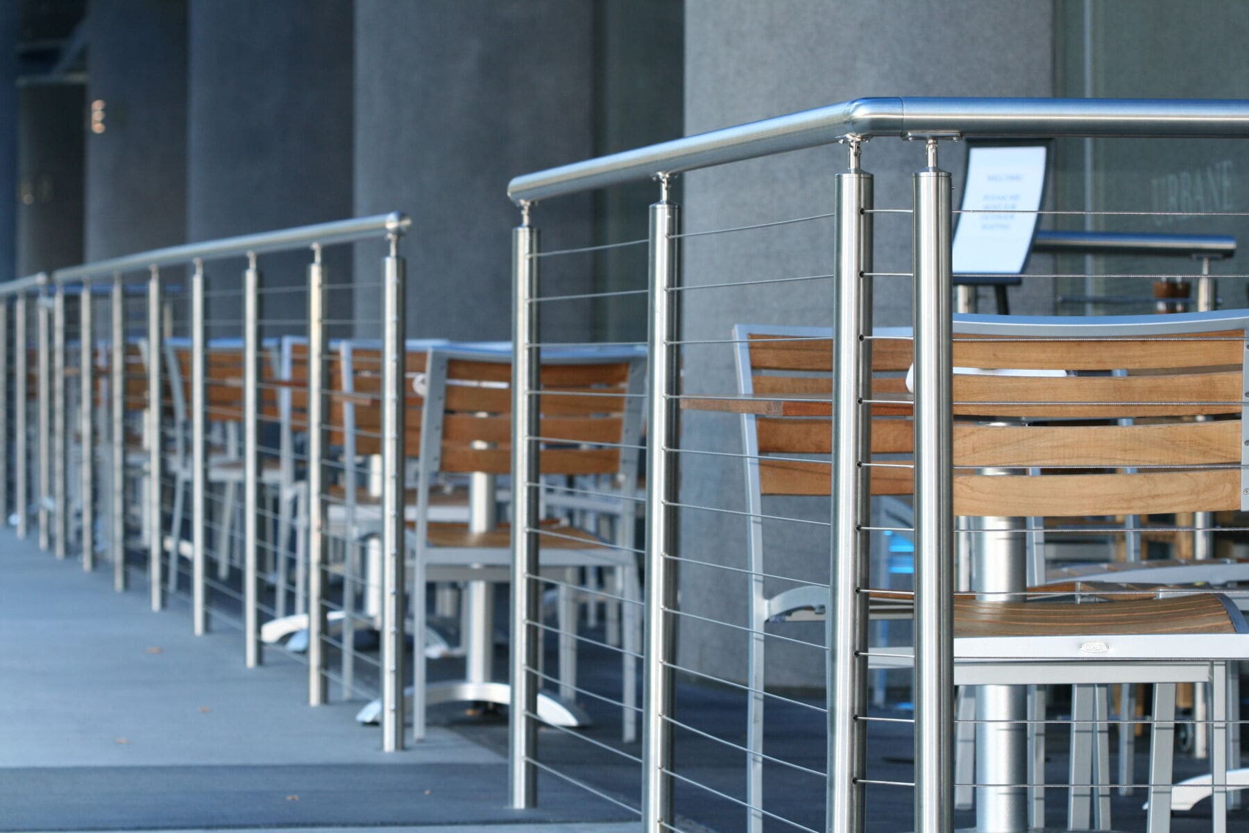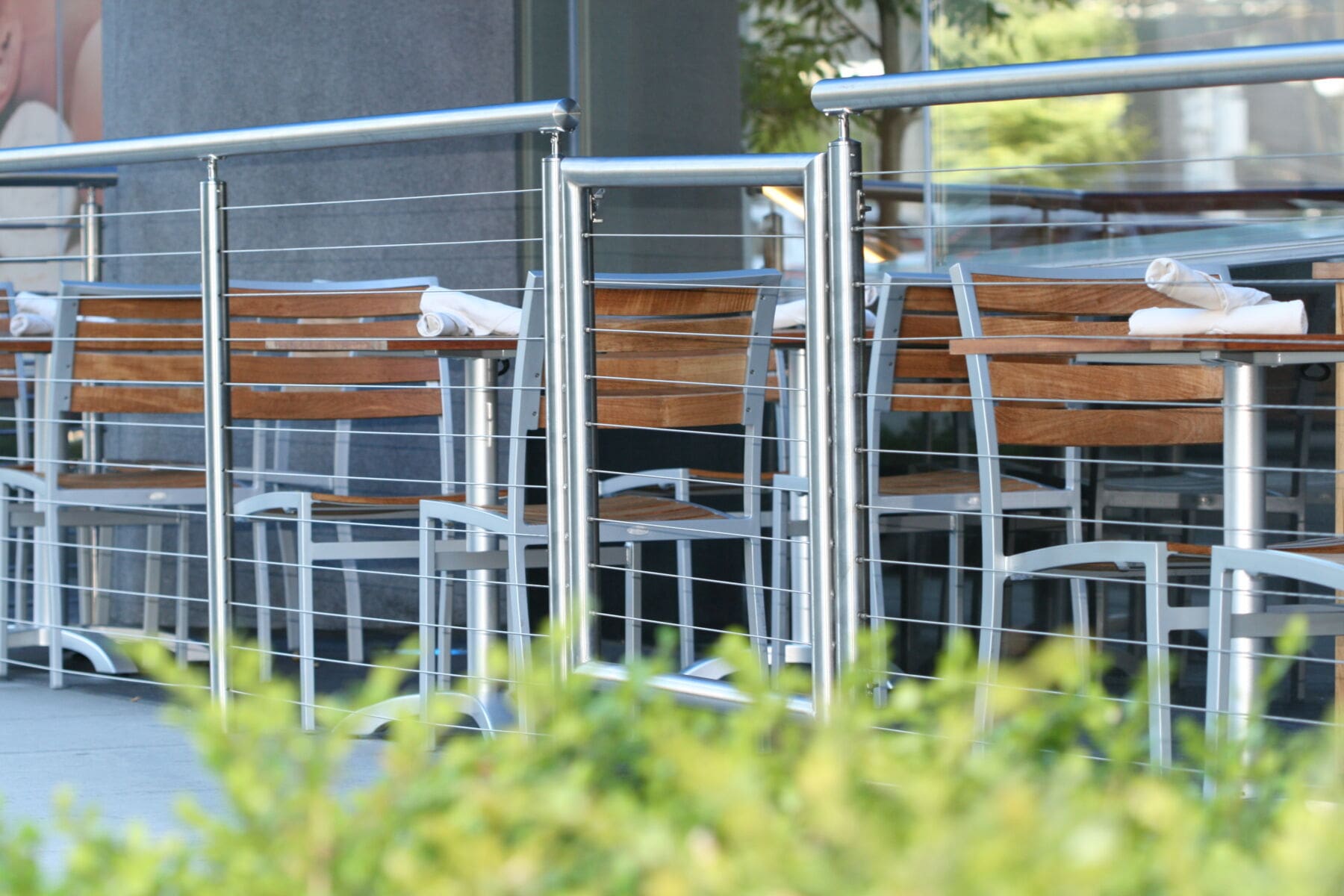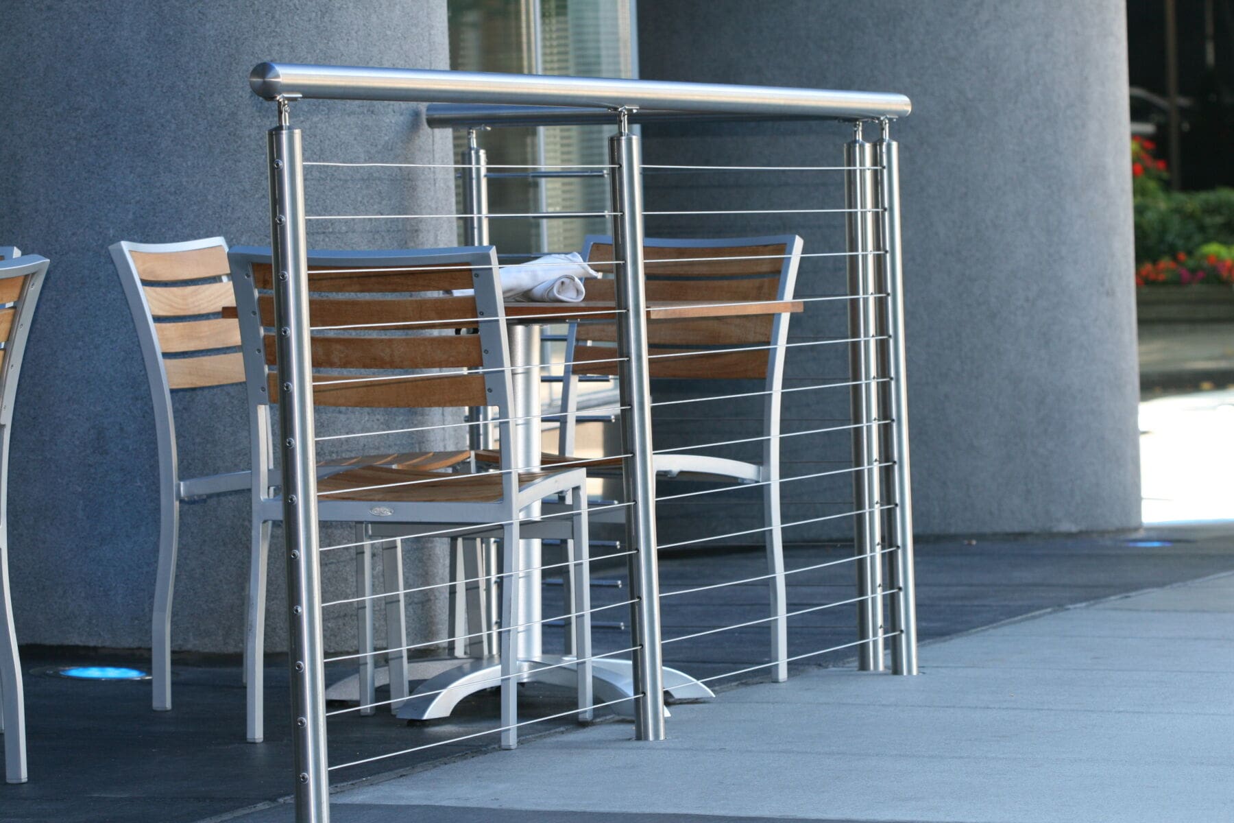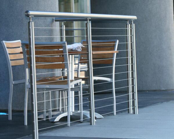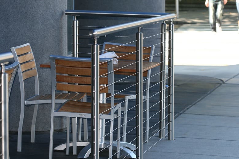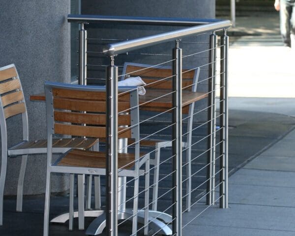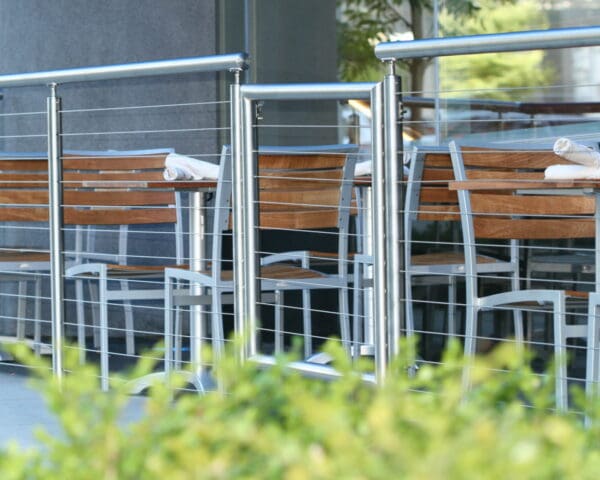 • Stainless Round Cable Railing Gate closes off the outdoor eating area while perfectly matching the rest of the system.
