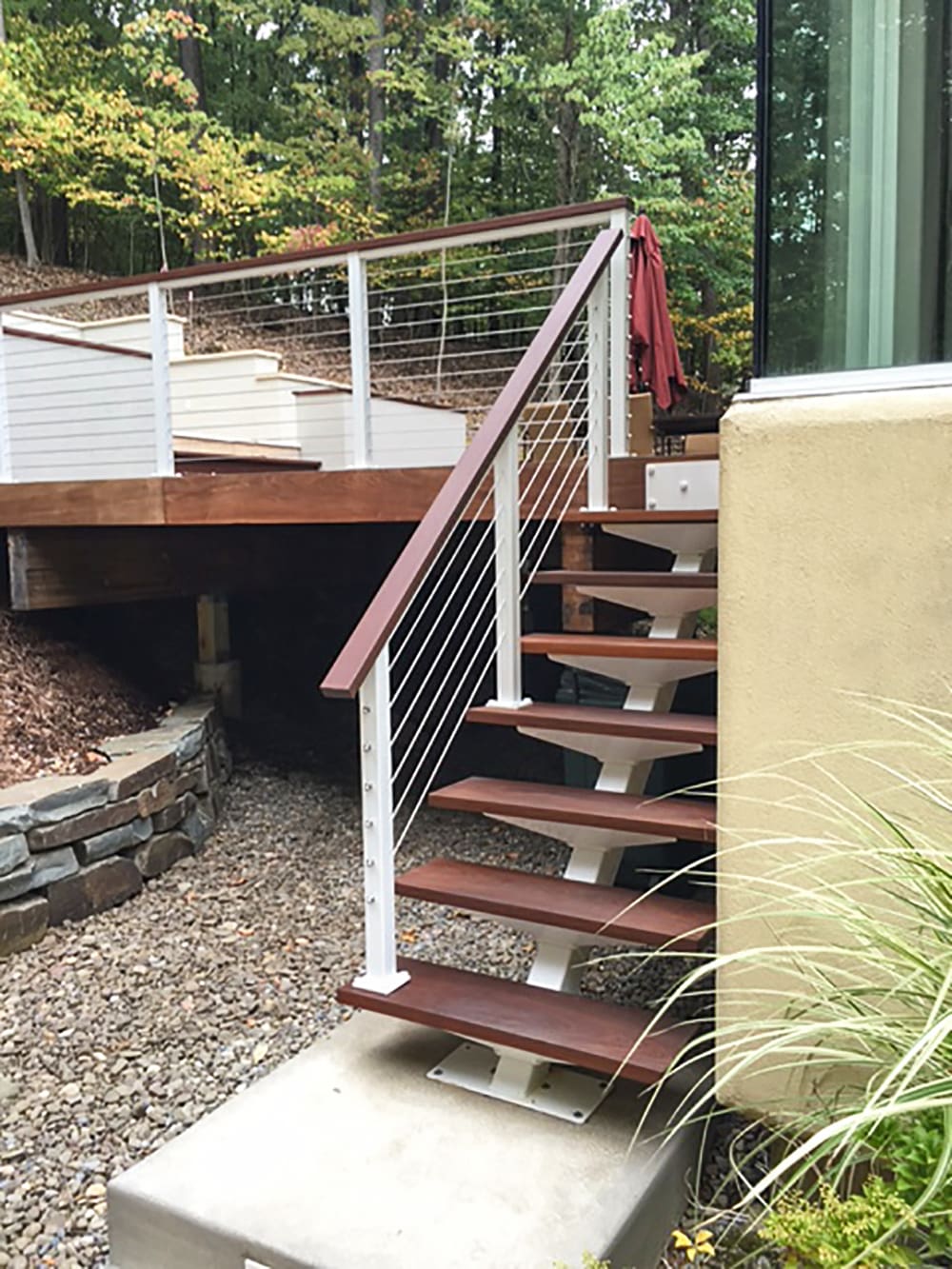 This Aluminum Cable Railing opens up the deck and backyard area of a contemporary New York home. The light railing glows against dark wood decking, while tying in thematically with the stucco house's white window frames and other accents.
