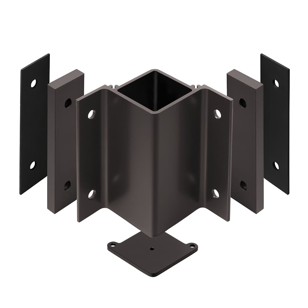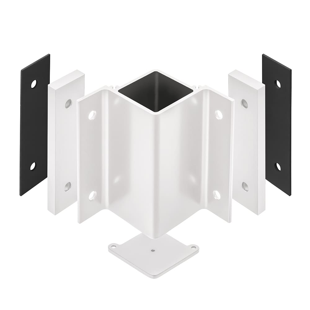 This inside corner aluminum fascia bracket allows you to more securely mount your corner posts to a fascia board. Featuring thicker walls, bottom plates, and anchoring screws, these heavy-duty brackets meet stricter building codes and are generally necessary for commercial applications.