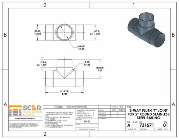 3-Way Flush “T” Joint for 2″ Round Stainless Steel Railing System