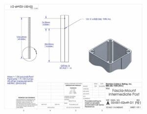 FASCIA MOUNT INTERMEDIATE POSTS are used between the TERMINAL POSTS and are spaced approximately every 4′. The wire rope passes through without loading the post. Each post is manufactured from 6063 T6 aluminum providing the strongest cable rail system available.