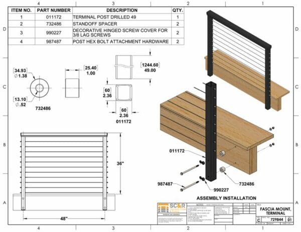 The FASCIA MOUNT TERMINAL POST mounts directly to the rim joist or fascia board by attachment hardware. Usually these are lag bolts (sold separately).