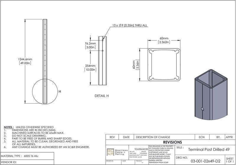 Terminal posts come either pre-drilled with powder-coated holes to eliminate many hours of installation labor, or undrilled (for surface mount fittings or custom drilling during installation). The drilled posts sold on this page are for flat runs. For stair runs, buy undrilled or call us for angled hole drilling.