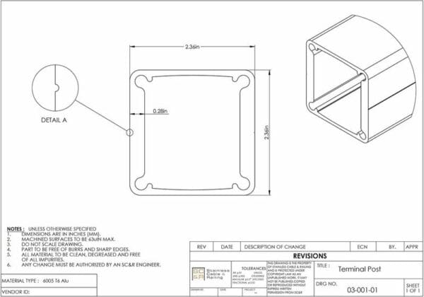 The foundation of any cable rail system is where the cables begin and end. Our FASCIA MOUNT TERMINAL POST is engineered specifically to withstand the applied stress when each wire rope is tensioned. Each aluminum railing post is manufactured from 6063 T6 aluminum with reinforced walls. Avoid competitor hollow posts that are designed for glass infill. When the cables are tightened in these cable railings, the posts tend to deflect, so the installer must decrease cable tension to reduce the bending.
