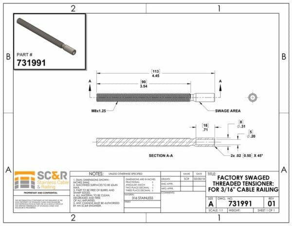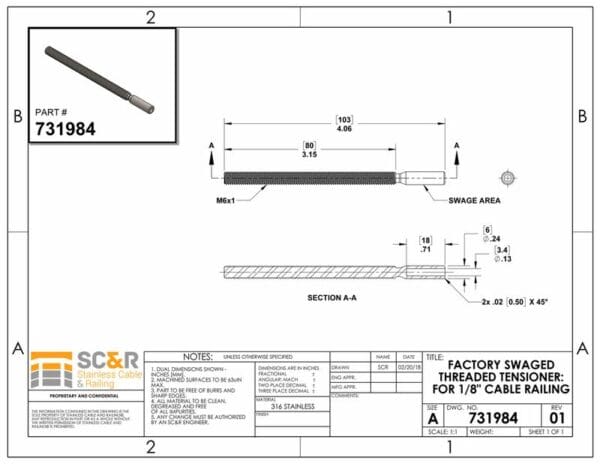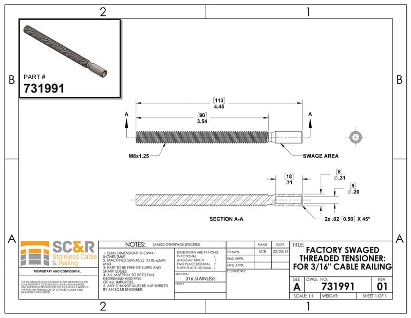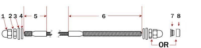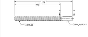- Size: M8 x 1.25RH for 3/16″ cable or M6 x 1.0RH for 1/8″ cable.