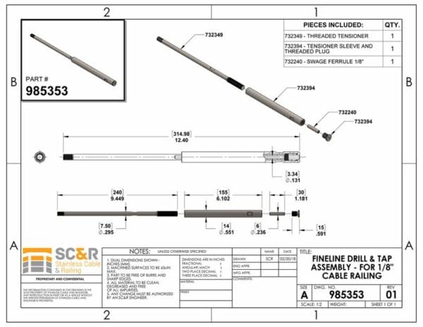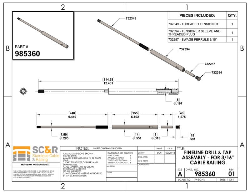 See number “1” in the above drawing to see how the FineLine™ DRILL & TAP TURNBUCKLE is used in the wire rope cable assembly.