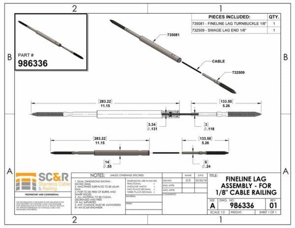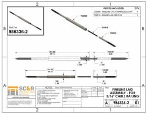 - Note: For all Assembly lengths >50′ (70′ max) and/or runs from 0-70′ with more than 1 90 degree corner, it is recommended to omit the SWAGE LAG END and use 2 FineLine™ LAG TURNBUCKLES instead to allow cable tightening at both ends of your run.