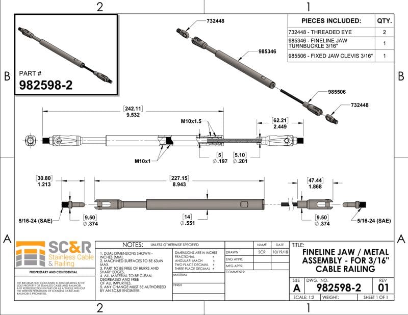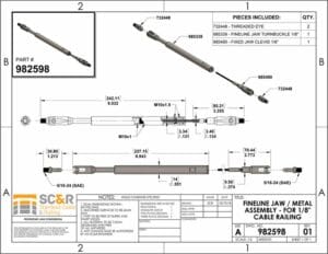 • Note: For all Assembly lengths >50′ (70′ max) and/or runs from 0-70′ with more than 1 90 degree corner, it is recommended to omit the FIXED JAW CLEVIS WITH CABLE and use 2 FineLine™ JAW TURNBUCKLES instead to allow cable tightening at both ends of your run. In this situation, substitute the FIXED JAW CLEVIS WITH CABLE with STAINLESS CABLE
