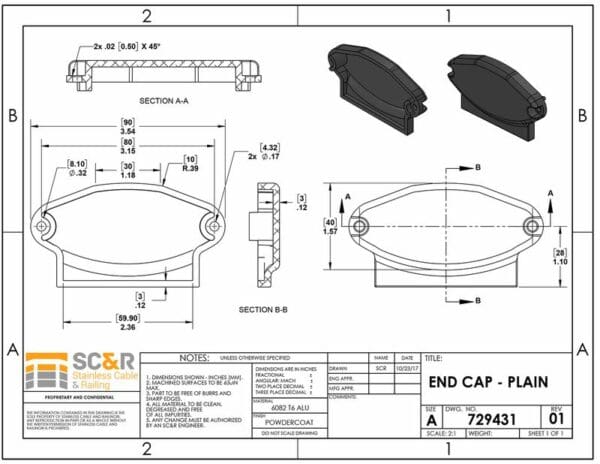 SHAPED/FLAT RAIL END FOR CABLE RAILING SYSTEMS