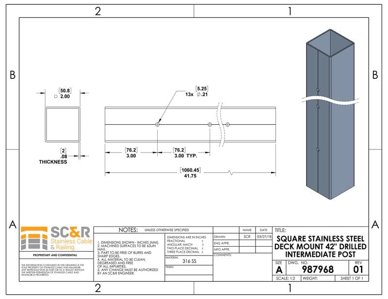 Square Stainless Steel Deck Mount 42in Drilled Intermediate Post