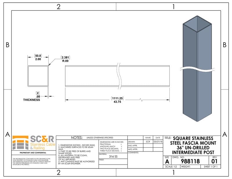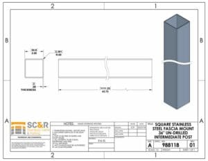 Square Stainless Steel Fascia Mount 36″ Un-Drilled Intermediate Post