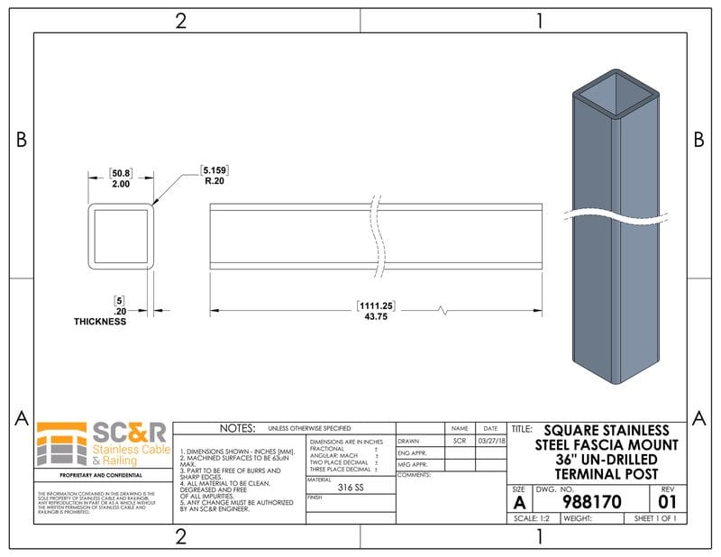 Square Stainless Steel Fascia Mount 36″ Un-Drilled Terminal Post
