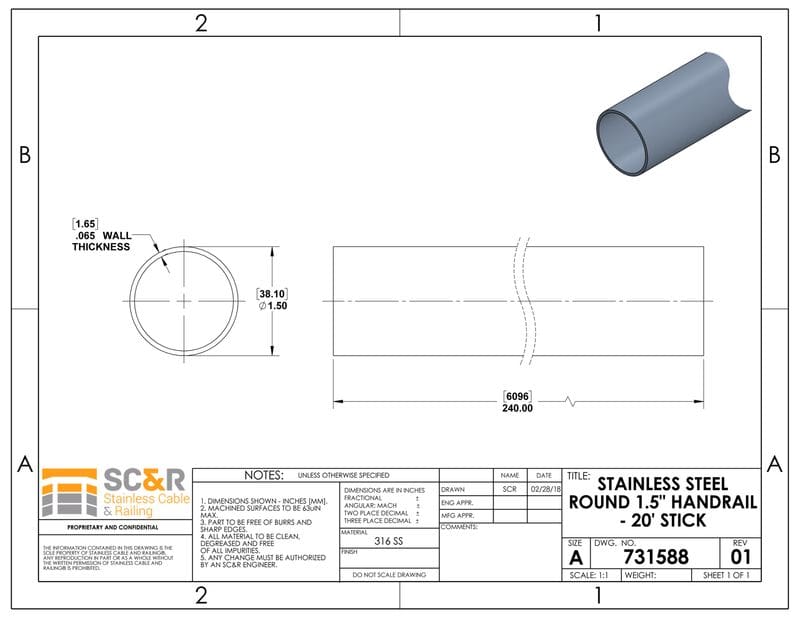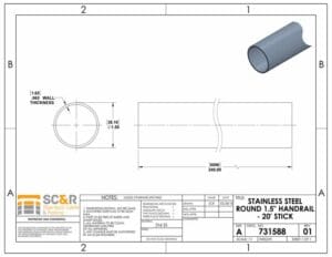 Stainless Steel Round 1.5″ Handrail – 20ft Stick