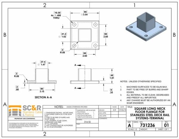 The stainless steel long neck floor flange square may be used as a surface floor mount for stainless steel posts. The posts or top cap slide right over the top of the flange for a secure fit. Install using our Lag Attachment Hardware. Sized for Terminal and Intermediate Square Posts which can be paired with stainless steel Round, Flat, or Wood top rail, or a customer-supplied top rail of your choosing to save money. All of our systems come with installation instructions that will guide any do-it-yourselfer through the process.