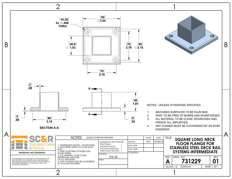 The stainless steel long neck floor flange square may be used as a surface floor mount for stainless steel posts. The posts or top cap slide right over the top of the flange for a secure fit. Install using our Lag Attachment Hardware. Sized for Terminal and Intermediate Square Posts which can be paired with stainless steel Round, Flat, or Wood top rail, or a customer-supplied top rail of your choosing to save money. All of our systems come with installation instructions that will guide any do-it-yourselfer through the process.