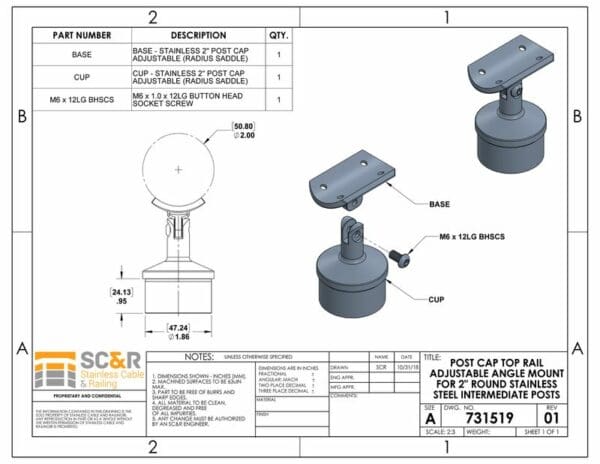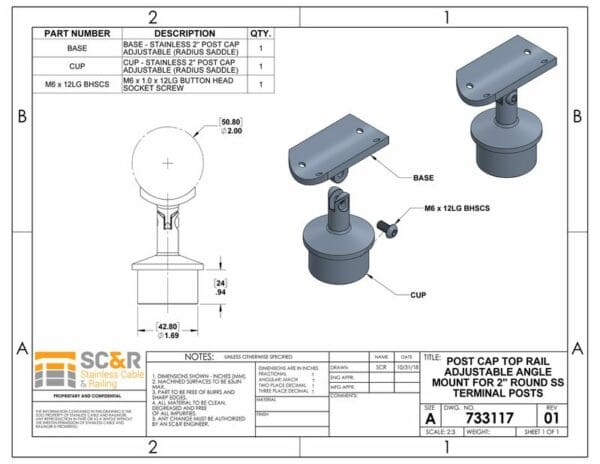 Post Cap Top Rail Adjustable Angle Mount for 2″ Round Stainless Steel Posts