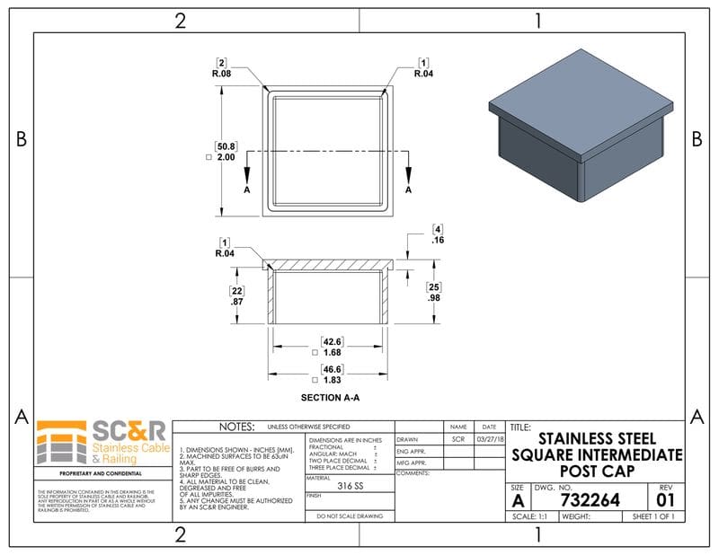 These square post caps will cover any remaining open ends of your stainless steel posts. Take note how many open ends are for intermediate or terminal posts, and order accordingly.