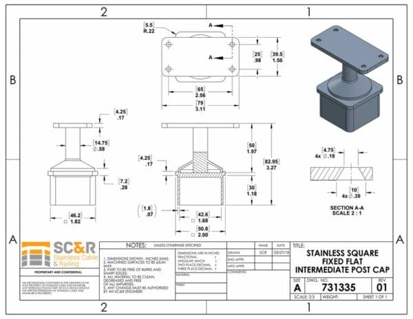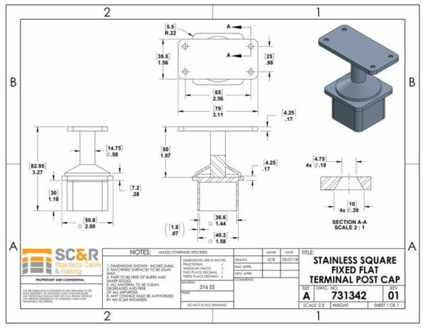 Stainless Square Fixed Flat Post Cap