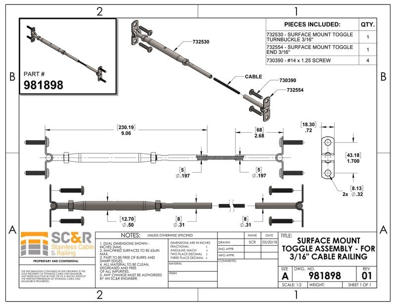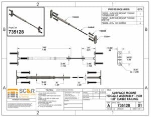 The SURFACE MOUNT TOGGLE ASSEMBLY is a unique fitting that surface mounts onto virtually any surface for use in architectural handrails. It is used for straight or angled cable runs with wood or metal posts. Use either PROFESSIONAL SWAGING SERVICE or HAND SWAGING