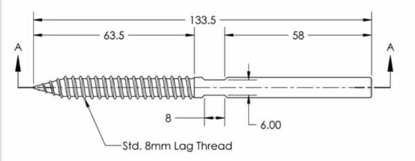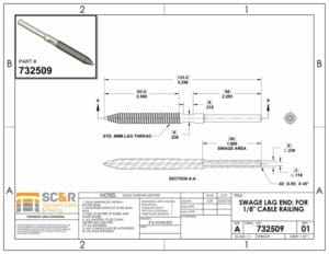 The SWAGE LAG END fitting is the terminal end of the FineLine™ LAG ASSEMBLY. This Assembly requires: 1 FineLine™ LAG TURNBUCKLE, CABLE, and 1 SWAGE LAG END. The number of cable runs is determined by post height. 3″ cable spacing is recommended.